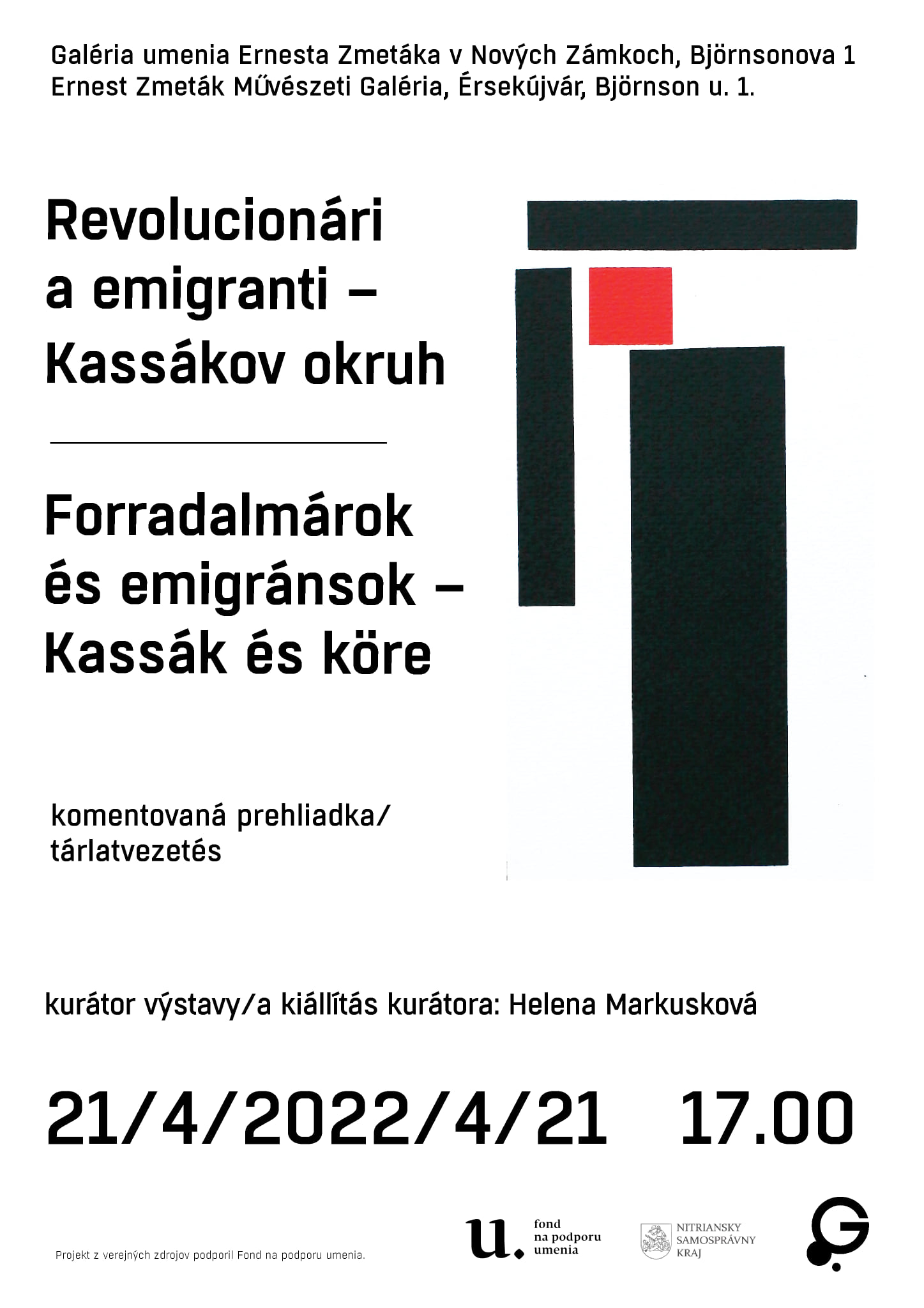 Galéria umenia Ernesta Zmetáka Vás pozýva na komentovanú prehliadku výstavy s názvom Revolucionári a emigranti - Kassákov okruh Termín: 21. 4. 2022 o 17,00 h. Kurátor výstavy: Helena Markusková Miesto: Galéria umenia Ernesta Zmetáková v Nových Zámkoch, Björnsonova 1, 940 56 Nové Zámky