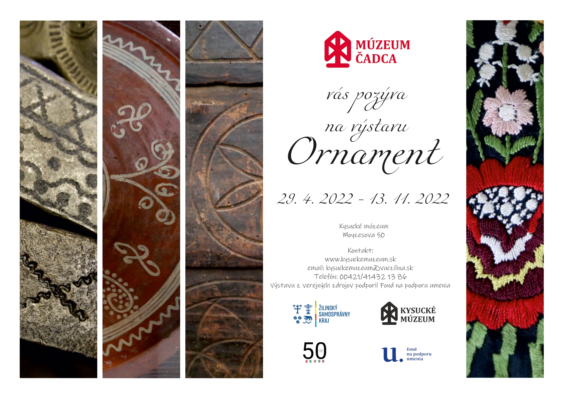 Kysucké múzeum pozýva návštevníkov na novú výstavu Ornament, ktorú z verejných zdrojov podporil Fond na podporu umenia. Výstava, ktorá potrvá od 29. apríla do 13. novembra 2022 prezentuje pestrosť ornamentálnej výzdoby na Kysuciach s využitím zbierkového a dokumentačného fondu Kysuckého múzea.