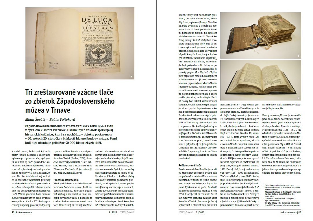 Článok o zreštaurovaných tlačiach (Pamiatky a múzeá). Prezentácii vybraných projektov je každoročne venované tretie číslo tohto časopisu.