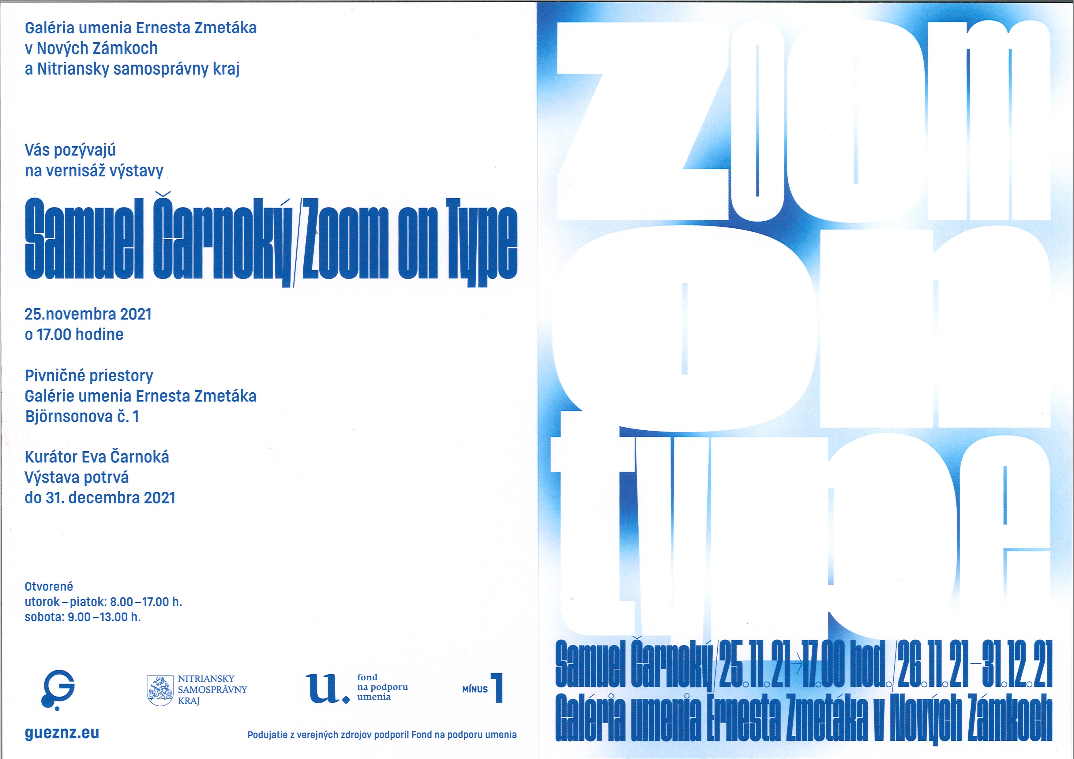 Galéria umenia Ernesta Zmetáka v Nových Zámkoch Vás pozýva na vernisáž výstavy Samuel Čarnoký / Zoom on Type. Otvorenie výstavy: 3. decembra 2021 o 17,00 hodine. Kurátor výstavy Eva Čarnoká Výstava potrvá do 31. decembra 2021. Otvorené: utorok - piatok 8,00 - 17,00 h., sobota : 9,00 - 13,00 h.