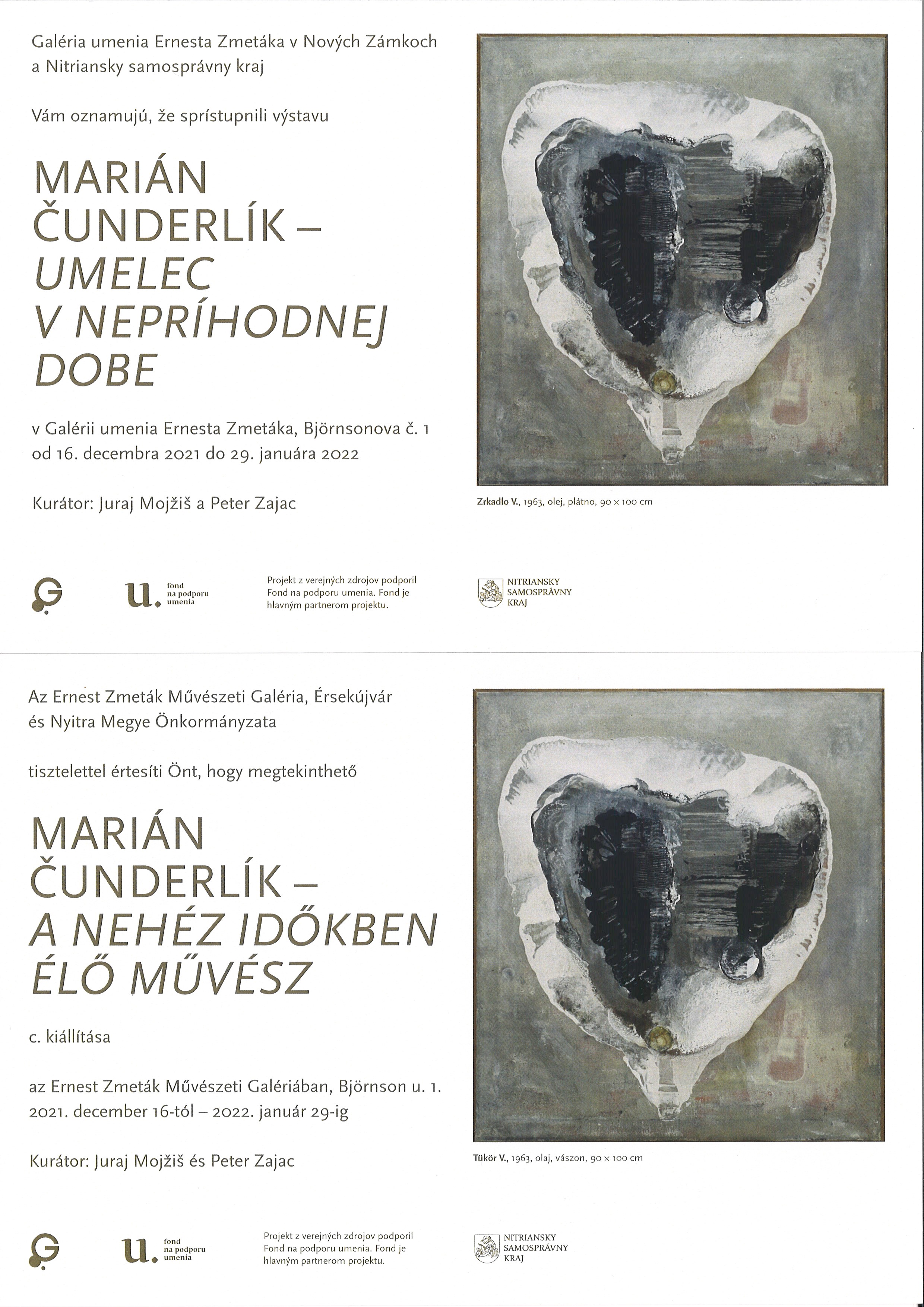 Galéria umenia Ernesta Zmetáka sprístupní výstavu s názvom Marián Čunderlík - Umelec v nepríhodnej dobe dňa 16. 12. 2021. Forma realizácie projektu: sprístupnenie výstavy bez vernisáže online formou.
