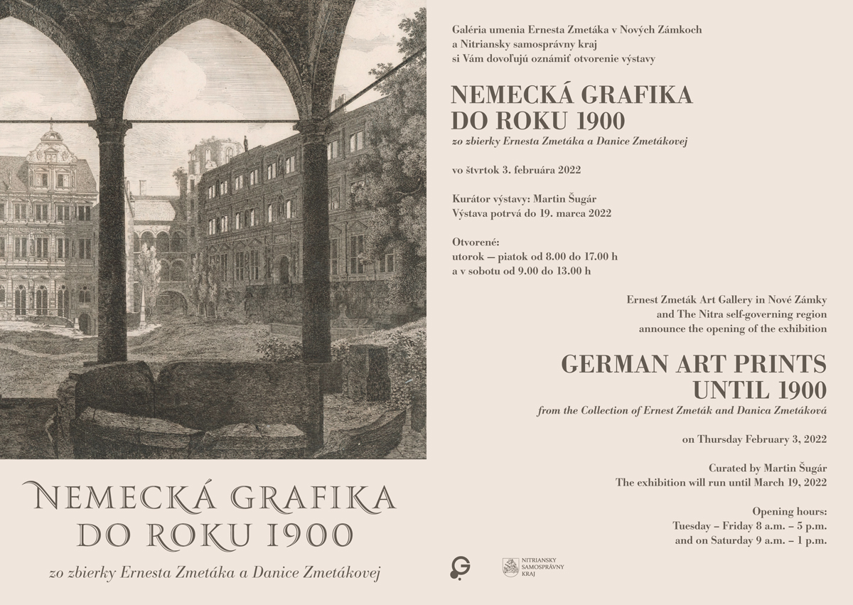 Galéria umenia Ernesta Zmetáka v Nových Zámkoch Vám dovoľujú oznámiť otvorenie výstavy NEMECKÁ GRAFIKA DO ROKU 1900 zo zbierky Ernesta Zmetáka na Danice Zmetákovej vo štvrtok 3. februára 2022. Kurátor výstavy: Martin Šugár. Výstava potrvá do 19. marca 2022. Otvorené: utorok - piatok od 8.00 do 17.00 h. a v sobotu od 9.00 do 13.00 h.