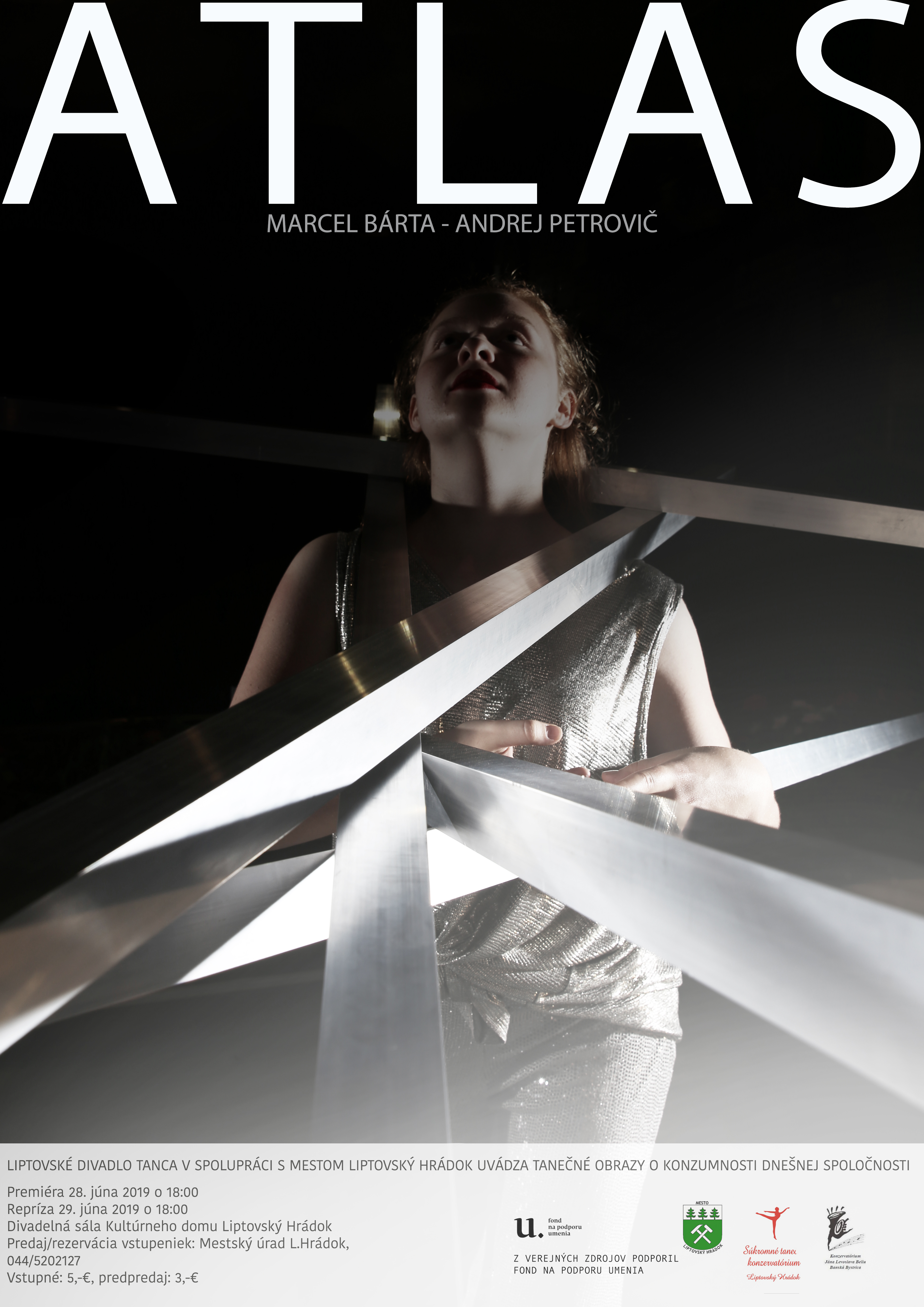 Tanečné obrazy inšpirované antickým odkazom Atlasa - mýtickej postavy obra, držiaceho na šiji nebeskú klenbu. Je tanečnou adaptáciou pre tínedžerov, vyrovnávajúcich sa s usmievajúcim sa konzumom. Inscenácia ATLAS prepája Tanec, živú Hudbu performera a skladateľa s tanečníkmi v netradičnom inscenačnom tvare, balansujúcom medzi tancom, performanciou a divadlom.