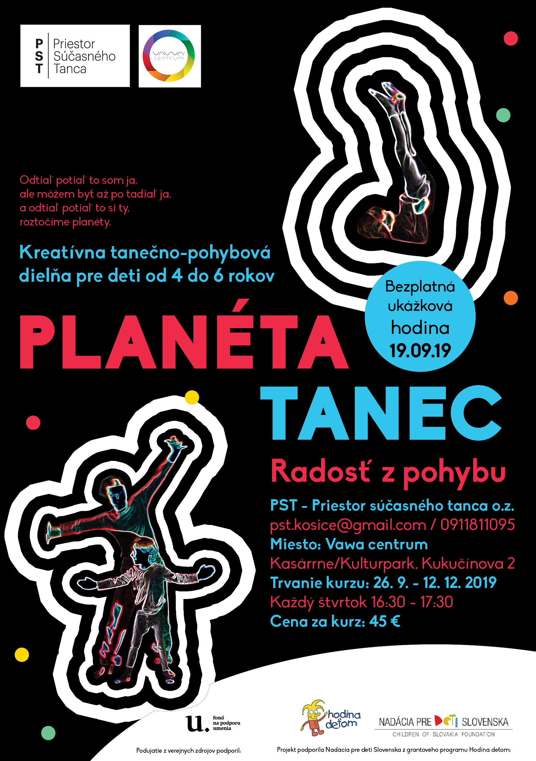 Kreatívnu tanečno-pohybovú dielňu Planéta Tanec pre deti vo veku 4 až 6 rokov. Deti na nej zažívajú radosť z tanca a zároveň tancom spoznávajú samých seba a svet navôkol.