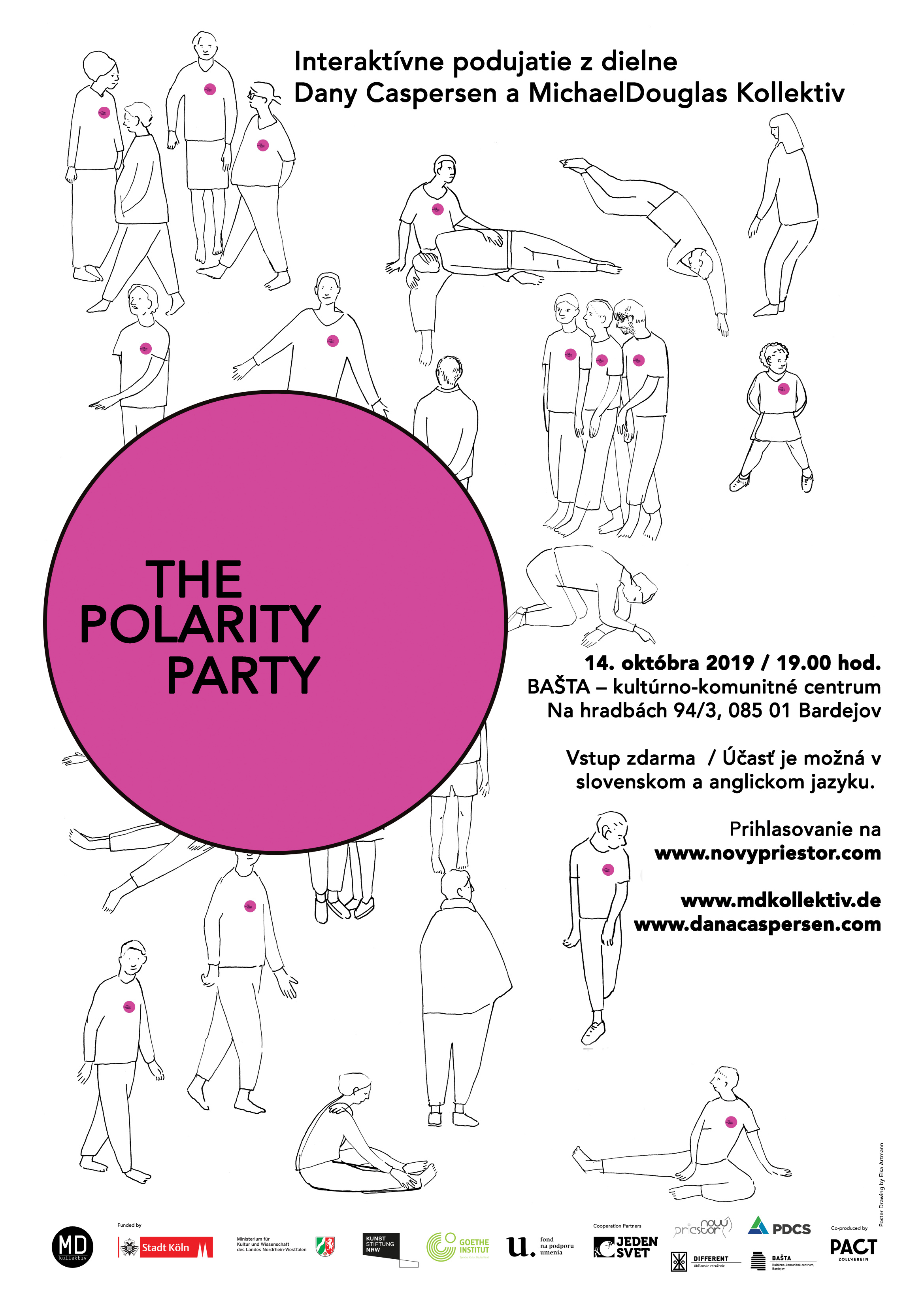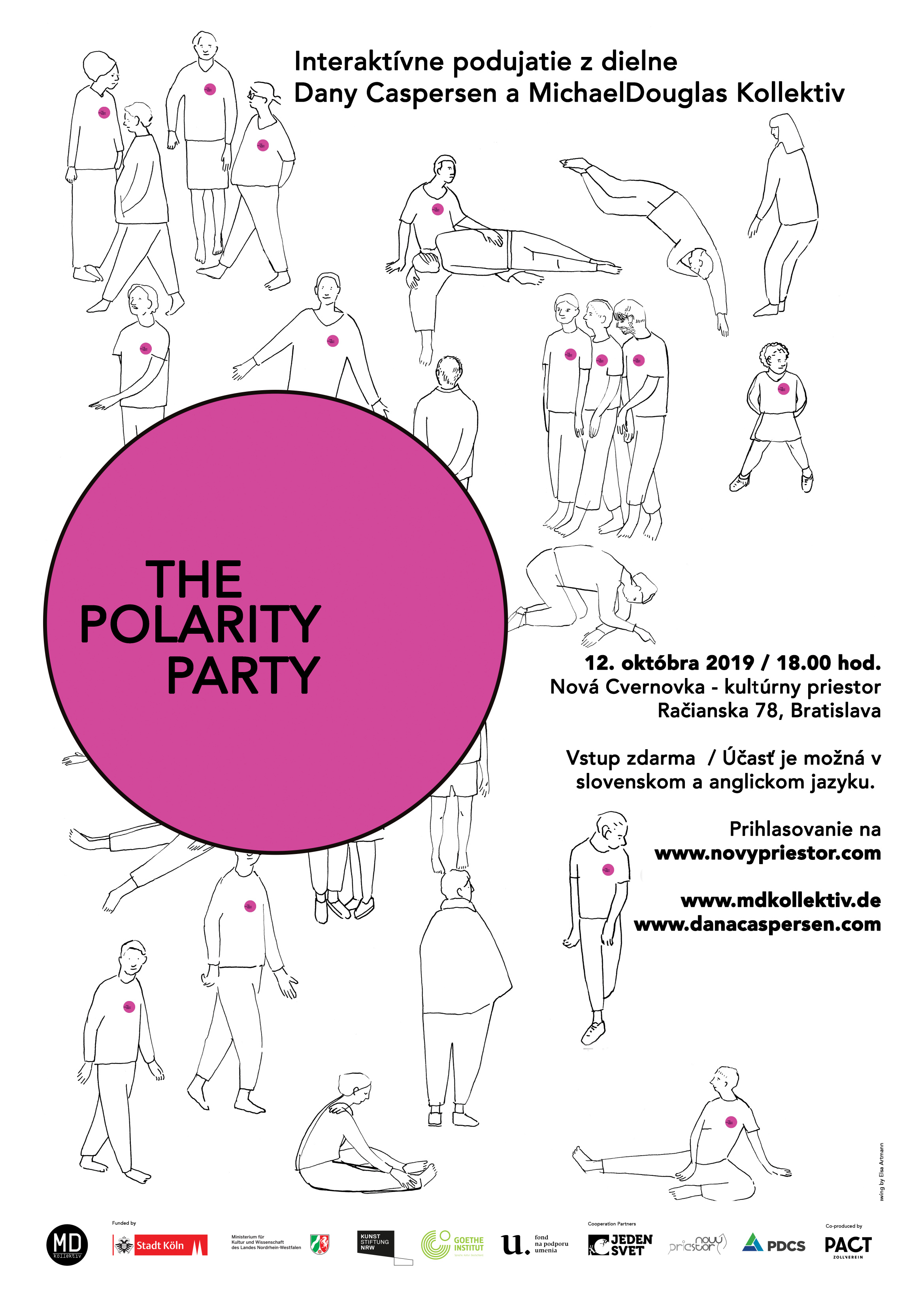 Hostia podujatia THE POLARITY PARTY vstupujú do tvorivej činnosti, pri ktorej sa choreografia kombinuje s riešením konfliktov. Na tomto interaktívnom podujatí nebude žiadne predstavenie, ani žiadni diváci. Naopak jednoduché aktivity ako chodenie, sedenie a rozprávanie budeme využívať ako nástroje na reflexiu a interakciu pri úvahách hostí o tom: Aká je naša úloha pri vytváraní alebo odstraňovaní systémov polarizácie spoločnosti?