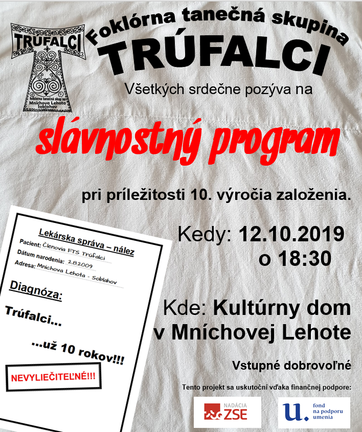 Slávnostný program pri príležitosti 10. výročia FTS Trúfalci V programe odprezentujeme doterajšiu tvorbu, ktorou sa FTS Trúfalci za 10 rokov prezentoval. Taktiež zopár nových programových čísel. Taktiež odprezentujeme basu a rekvizity zakúpené s podporou FPU.