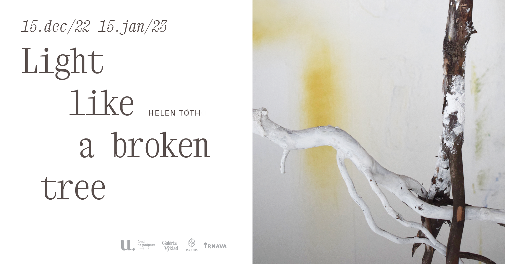 Výstavný projekt Helen Tóth, s názvom Light, like a broken tree, predstavuje autorkin dlhoročný záujem o stromy, lesy, ekosystém, a o hľadanie symbiotického vzťahu medzi prírodou a človekom.