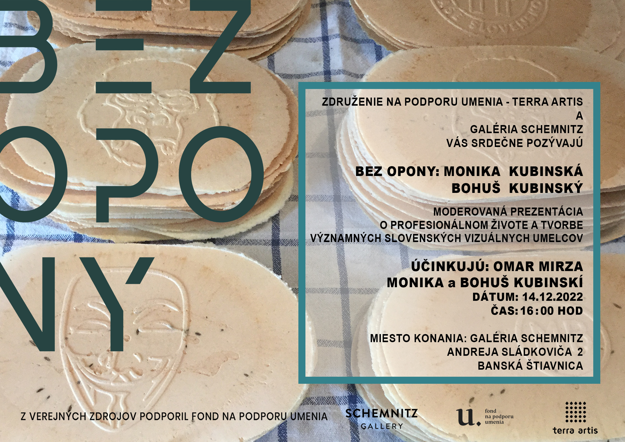 V rámci cyklu Bez opony, vzdelávacej prezentácie o živote a tvorbe autorskej dvojice Moniky a Bohuša Kubinských moderovanej kurátorom Omarom Mirzom, predstavíme projekty, ktoré v minulosti zrealizovali v Banskej Štiavnici a prezradia niečo o novom projekte s názvom Udalosti a komentáre, na ktorom aktuálne pracujú.