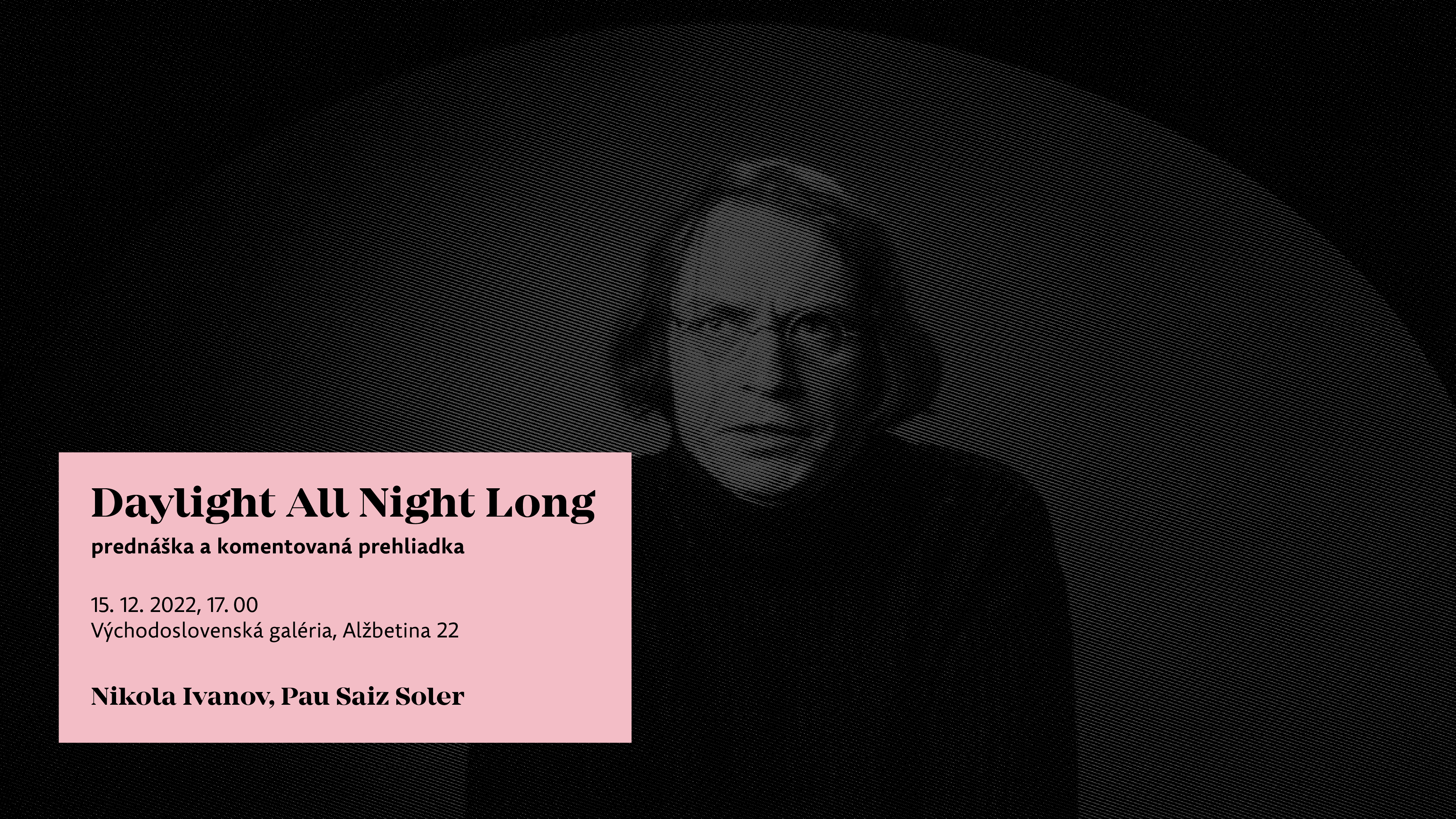 Zimné Open Studios Night bude patriť našim dvom rezidentom Nikolovi Ivanovovi (CZ) a Pauovi Saiz Solerovi (ESP). Počas večera vám predstavia východiská svojej tvorby a porozprávajú o projekte Second Sun, ktorý vytvorili v rámci mediaartového festivalu Art&Tech Days počas ich dvojmesačnej rezidencie v Košiciach.