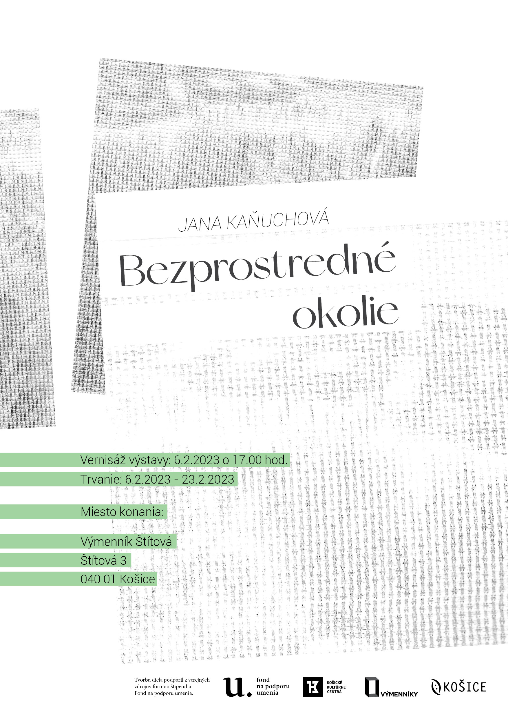 Výstava aktuálneho projektu Jany Kaňuchovej Bezprostredné okolie. Vernisáž 6.2.2023 o 17.00 hod., Výmenník Štítová, Štítová 3, 040 01 Košice. Trvanie výstavy: 6.2.2023 - 23.2.2023. Ste srdečne pozvaní.