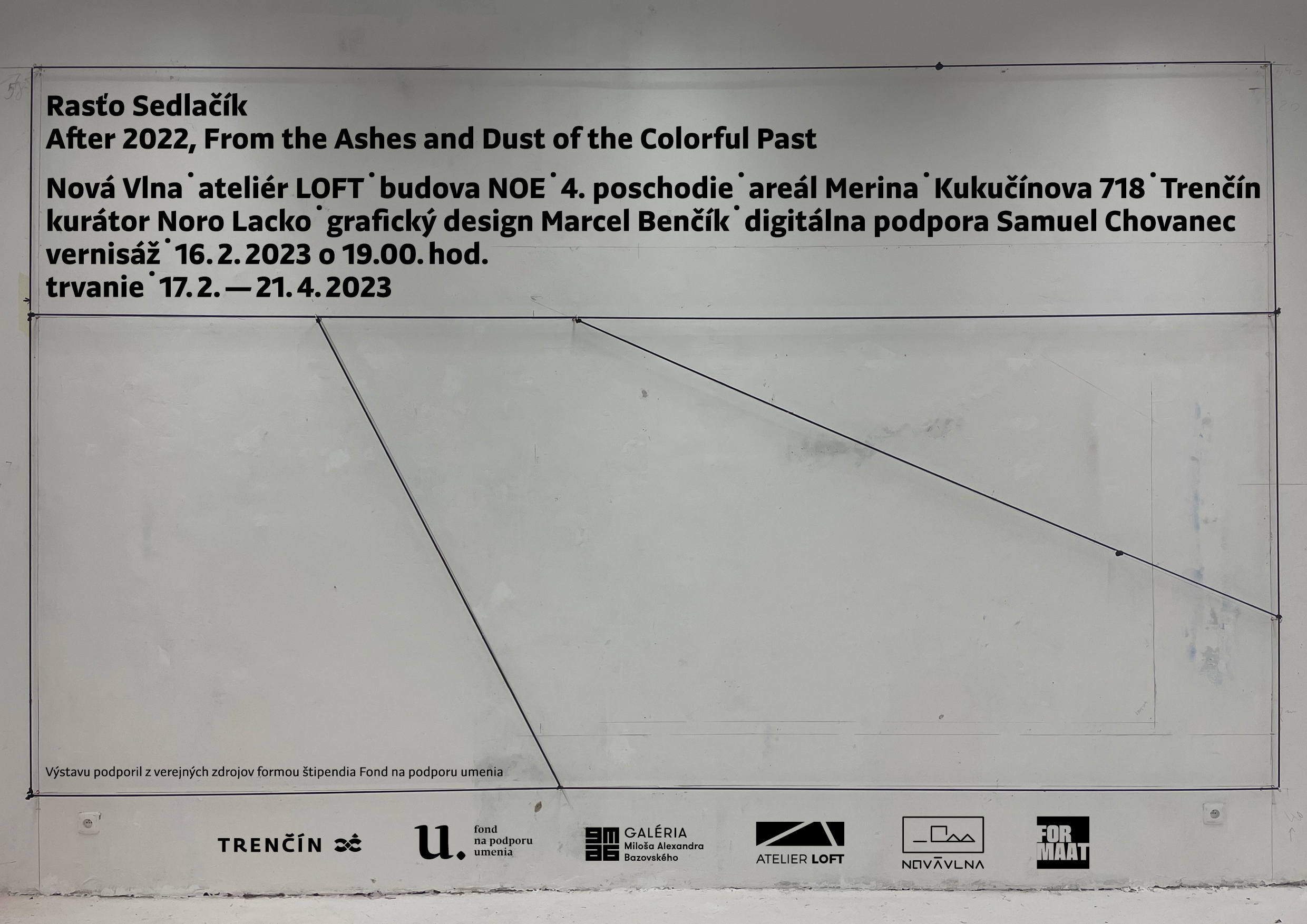 Rasťo Sedlačík After 2022, From the Ashes and Dust of the Colorful Past Nová Vlna / ateliér LOFT / budova NOE / 4. poschodie / areál Merina / Kukučínova 718 / Trenčín kurátor: Noro Lacko grafický design: Marcel Benčík digitálna podpora: Samuel Chovanec vernisáž: 16. 2. 2023 o 19.00. hod. trvanie výstavy: 17. 2. – 21. 4. 2023 https://www.ra100sedlacik.sk/after-2022-from-the-ashes-and-dust-of-the-colorful-past