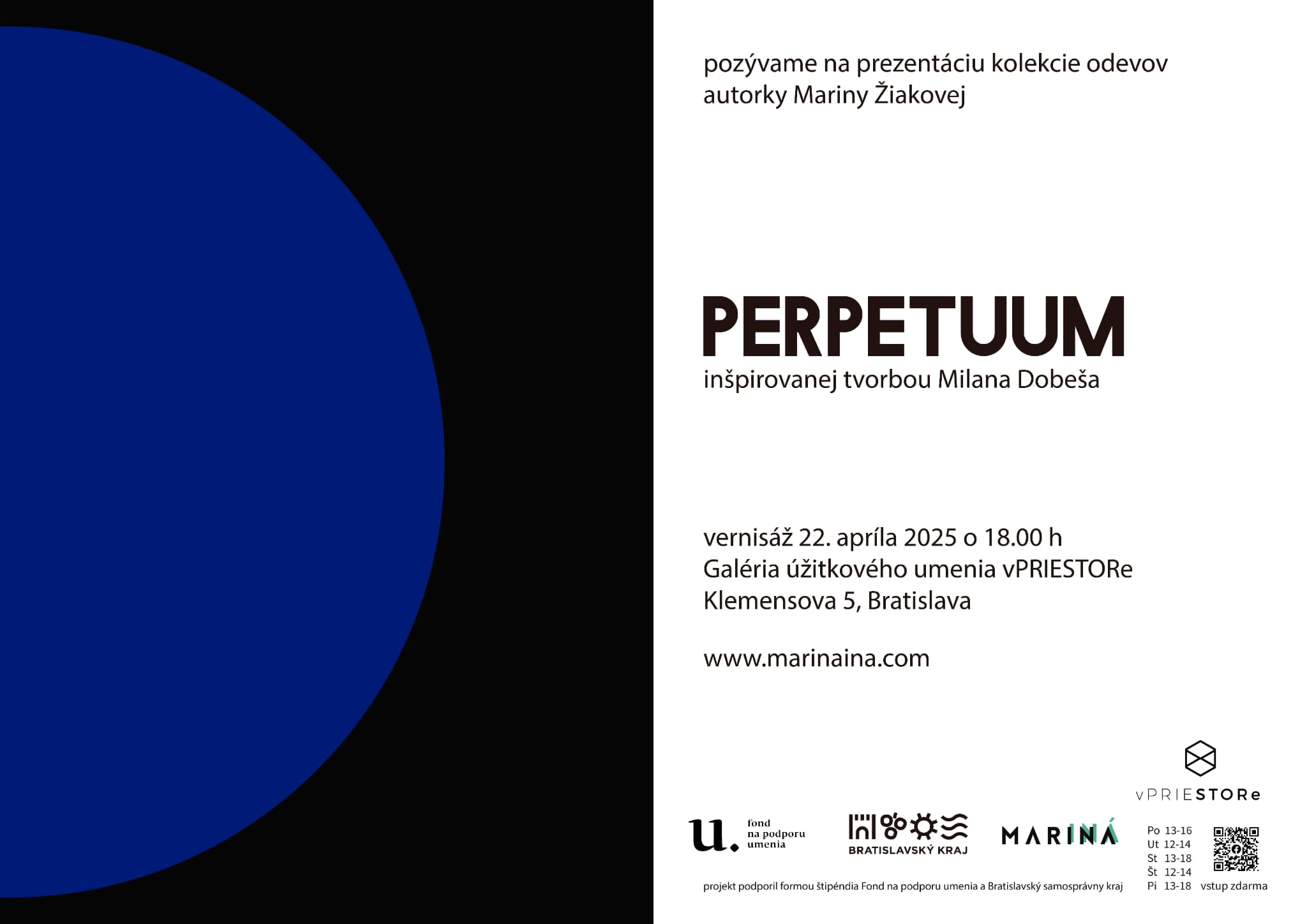Pozvánka na hlavný výstup projektu, prezentáciu kolekcie PERPETUUM v galérii úžitkového umenia v vPRIESTORe dňa 22.4 2025 o 18.00