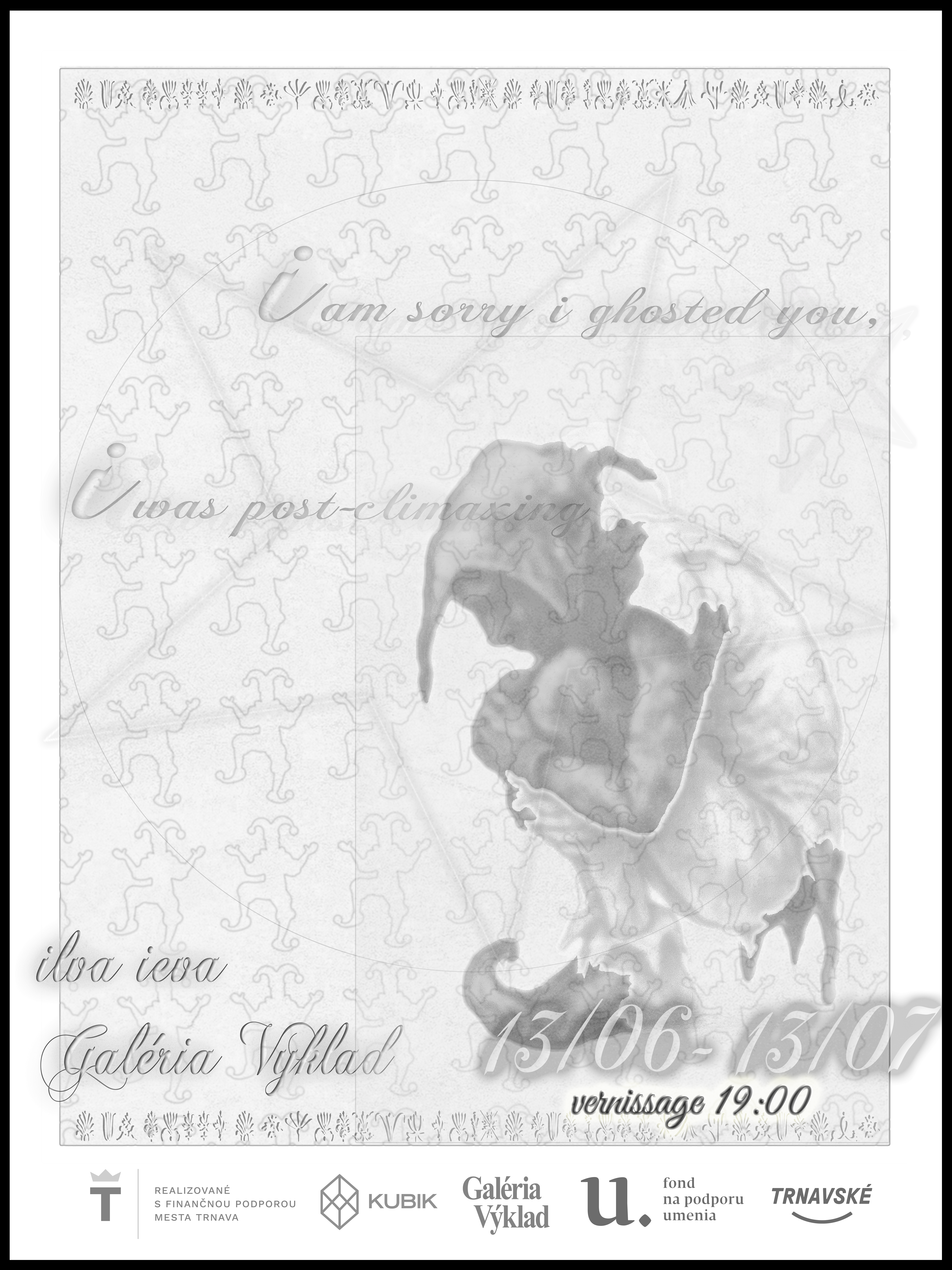 Ilva Ieva je lotyšská intermediálna umelkyňa, ktorá momentálne pôsobí v Prahe. Pracuje s rozkladajúcimi sa inštaláciami, špekulatívnymi mytológiami či sochárskymi objektmi. Vo výstave "i am sorry i ghosted you, i was post-climaxing"skúma duchov, ktorých nosíme v útrobách, detské sny, ktoré sa niekde po ceste rozpadli, nedopovedané rozhovory, časti nás samých, o ktoré sme nechceli prísť, ľudí, ktorými sme mohli byť – ale nikdy sme sa nimi nestali.