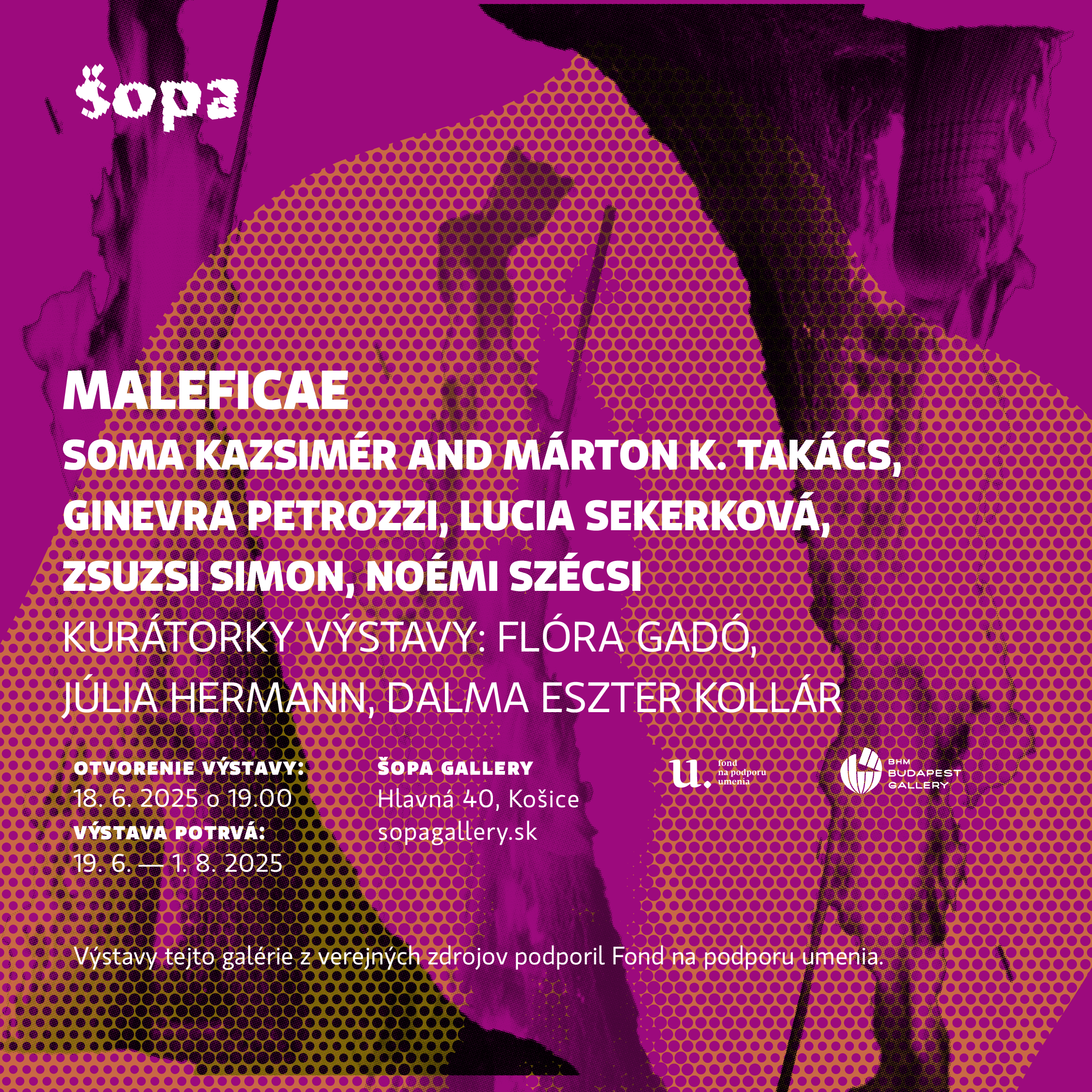 Maleficae Soma Kazsimér & Márton K. Takács Ginevra Petrozzi Lucia Sekerková Zsuzsi Simon Noémi Szécsi Kurátorky výstavy: Flóra Gadó, Júlia Hermann, Dalma Eszter Kollár Otvorenie výstavy: 18. 6. 2025 / 19.00 hod. Trvanie výstavy: 19. 6. - 1. 8. 2025 Šopa Gallery, Hlavná 40, Košice Otváracie hodiny: STR - PIA / 15.00 - 18.00 SOB / 13.00 - 18.00