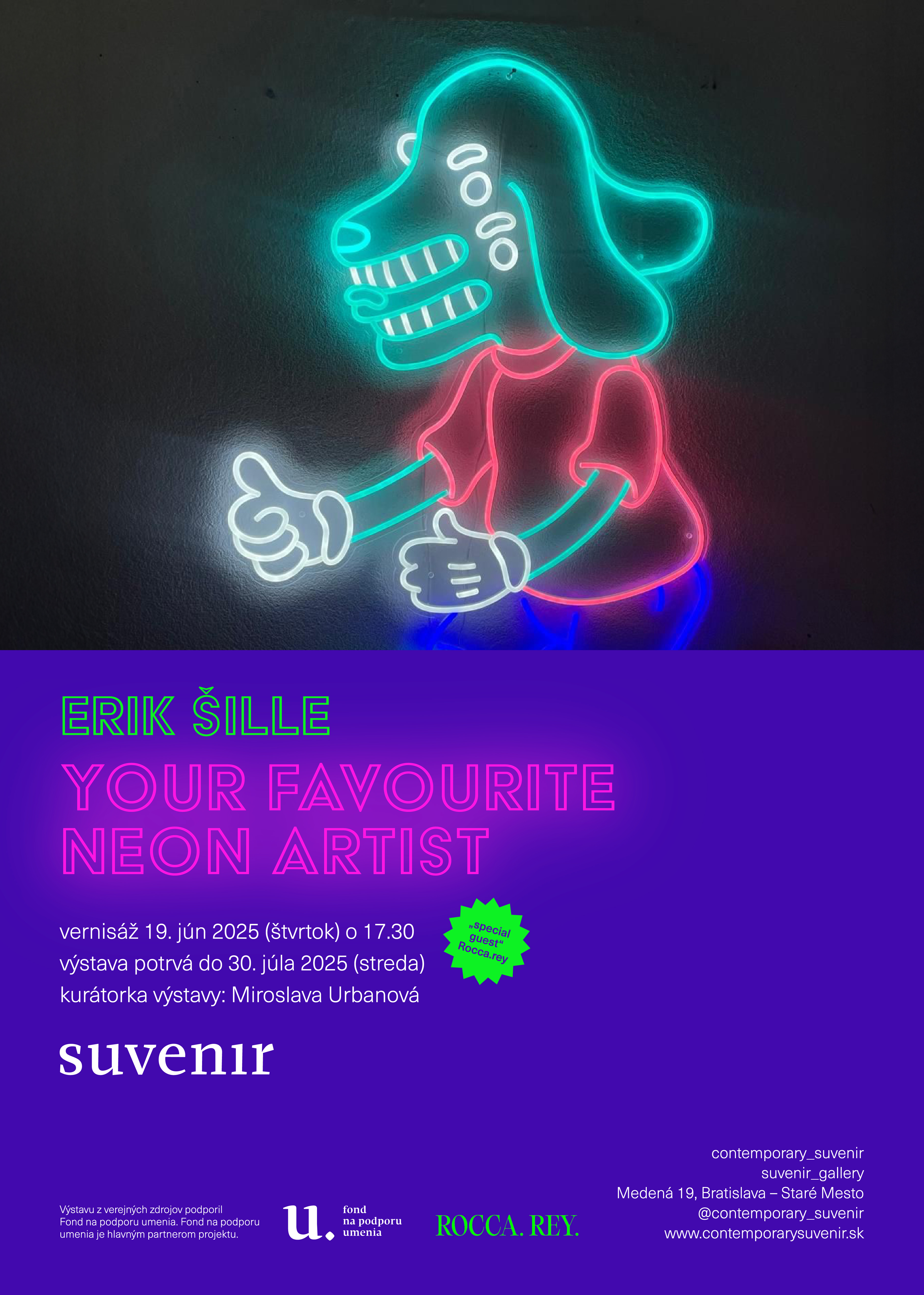 suvenir_gallery exhibition: Erik Šille: Your Favourite Neon Artist Vernisáž: 19. 6. 2025 o 17:30 (štvrtok) Trvanie výstavy: Kurátorka výstavy: Miroslava Urbanová Dramaturgia výstavy: Nina A. Šošková ArtD. Produkcia a technická výpomoc: Mgr. art. Diana Čižmárová, Mgr. Richard Augustín Grafický dizajn: Lucia Švagerková Miesto konania: contemporary_suvenir, suvenir_gallery, Medená 19, Bratislava - Staré Mesto, 81102 www.contemporarysuvenir.sk Projekt z verejných zdrojov podporil Fond na
