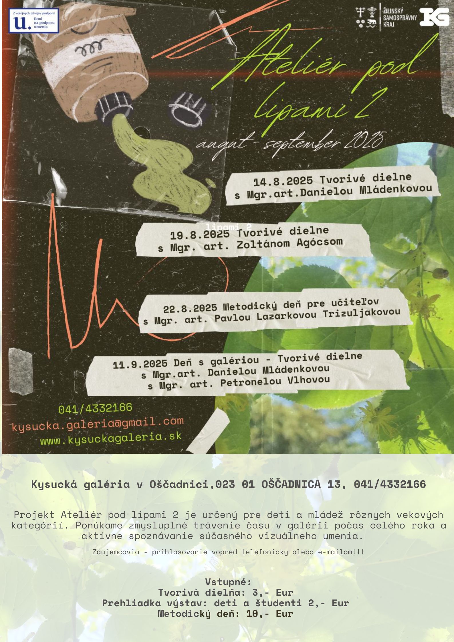 Projekt Ateliér pod lipami 2 realizovaný v Kysuckej galérii v tomto roku je určený pre deti a mládež, ktorého zámerom je ponúknuť zmysluplné trávenie času v galérii počas celého roka a aktívne spoznávanie súčasného vizuálneho umenia.