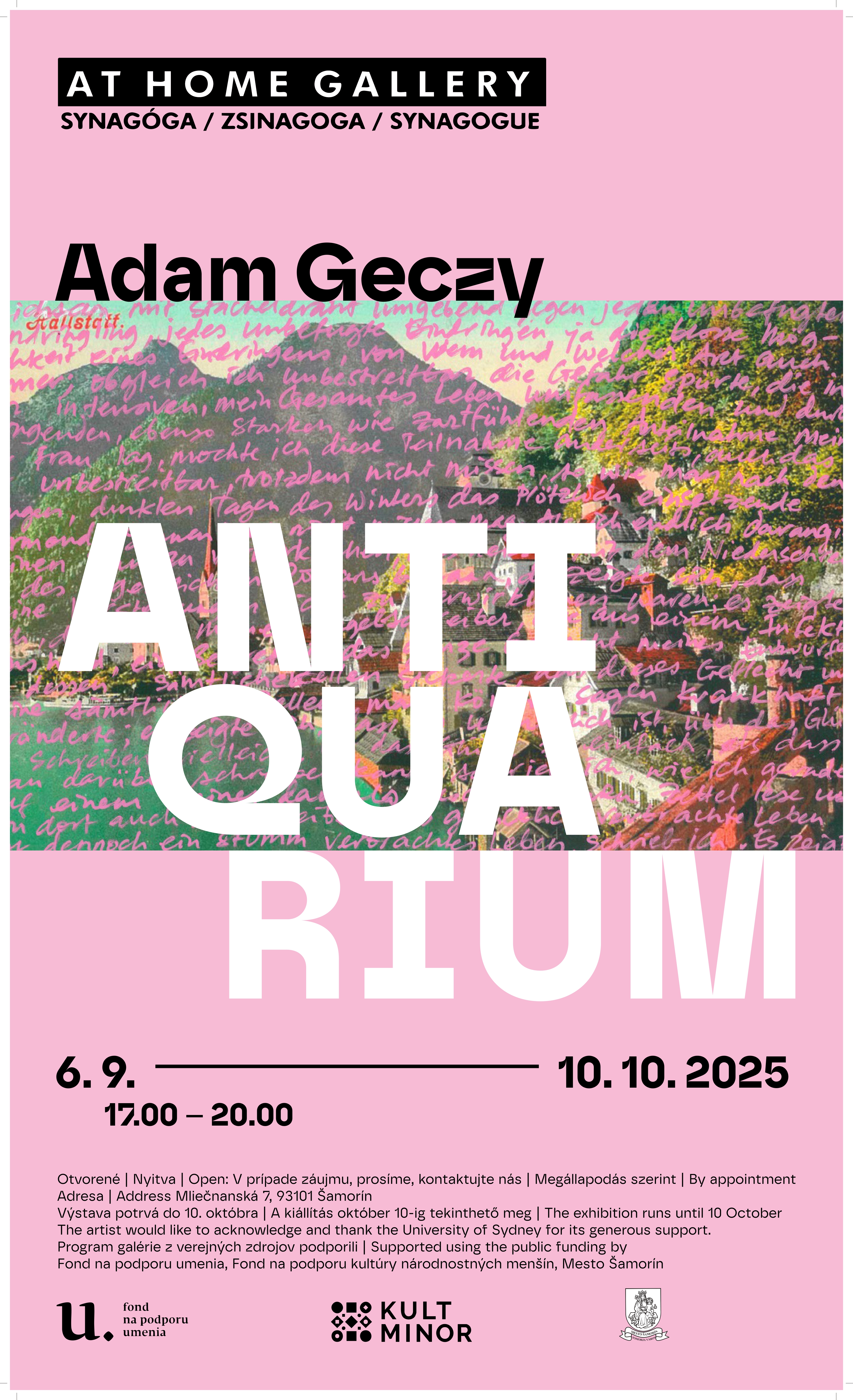 Výstava Antiquarium / Antikvárium Adama Geczyho,( 6. 9. – 10. 10. 2025, At Home Gallery Šamorín) prináša fotografie, objekty a videá, ktoré skúmajú pamäť, stratu a historickú traumu. Staré portréty, baletné špičky s kamienkami a apokalyptické scény odhaľujú krehkosť prítomnosti, pripomínajú zabudnuté príbehy a kladú otázky o našej zodpovednosti voči minulosti i budúcnosti.