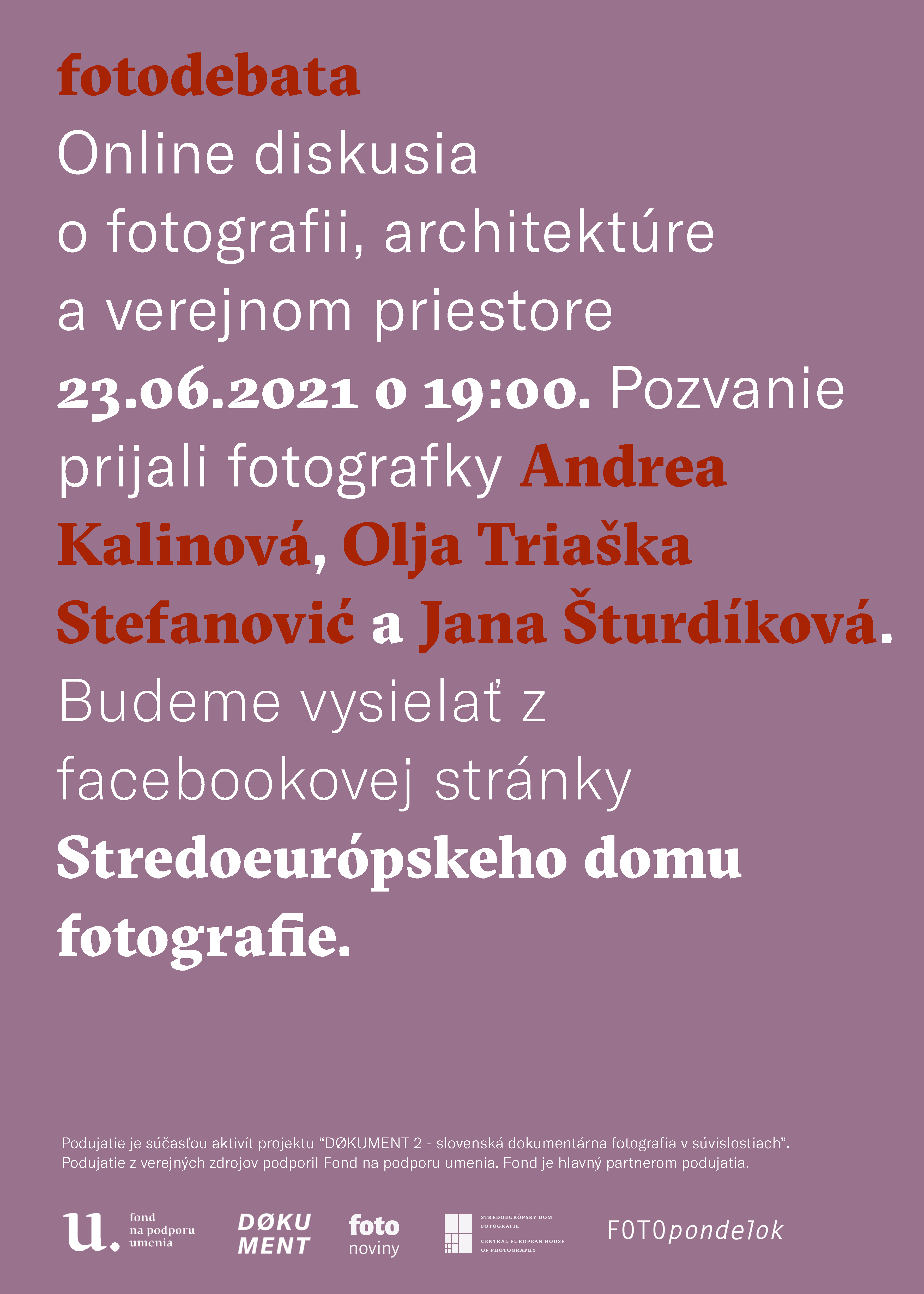 Online diskusia o fotografii, architektúre a verejnom priestore. Hostia: Andrea Kalinová, Olja Triaška Stefanović a Jana Šturdíková. Moderuje: Ján Viazanička