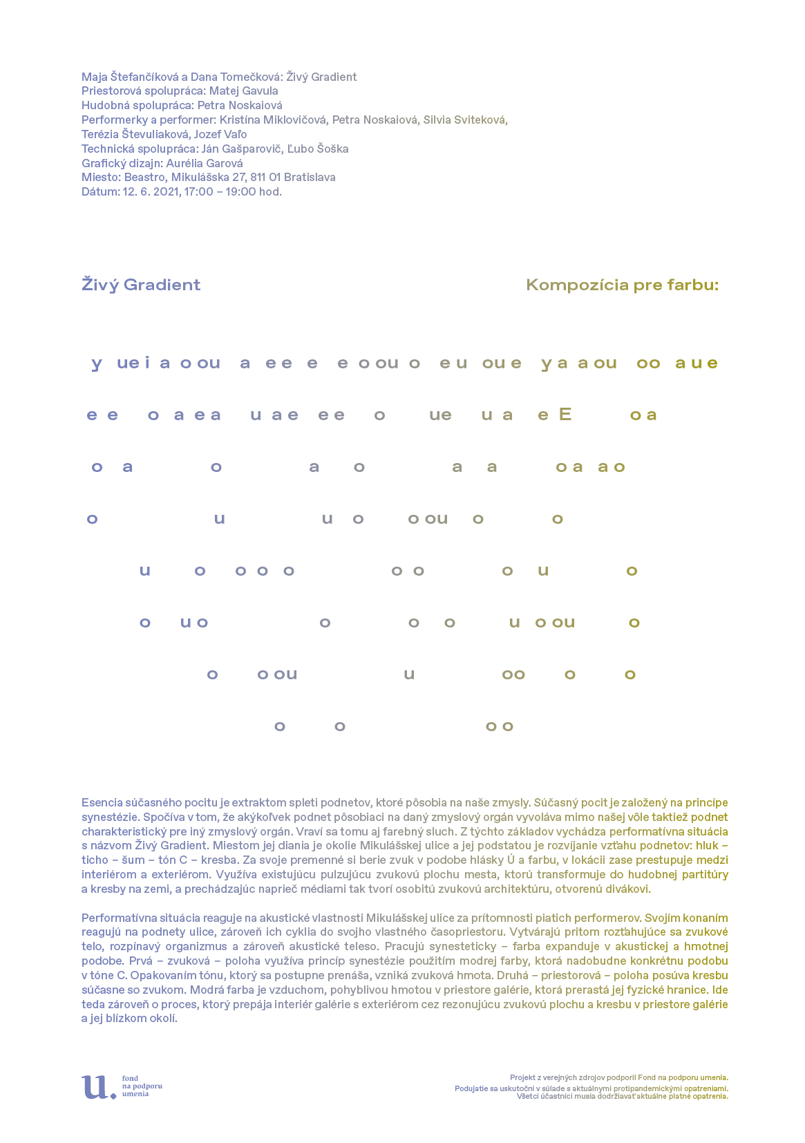 Performatívna situácia Živý gradient sa konala dňa 12. júna 2021 v galérii Beasto a v jej bezprostrednom okolí. Piati performeri vďaka spevu a pohybu vytvorili dočasný zásah, na základe ktorého nastal posun vo vnímaní bežnej reality.