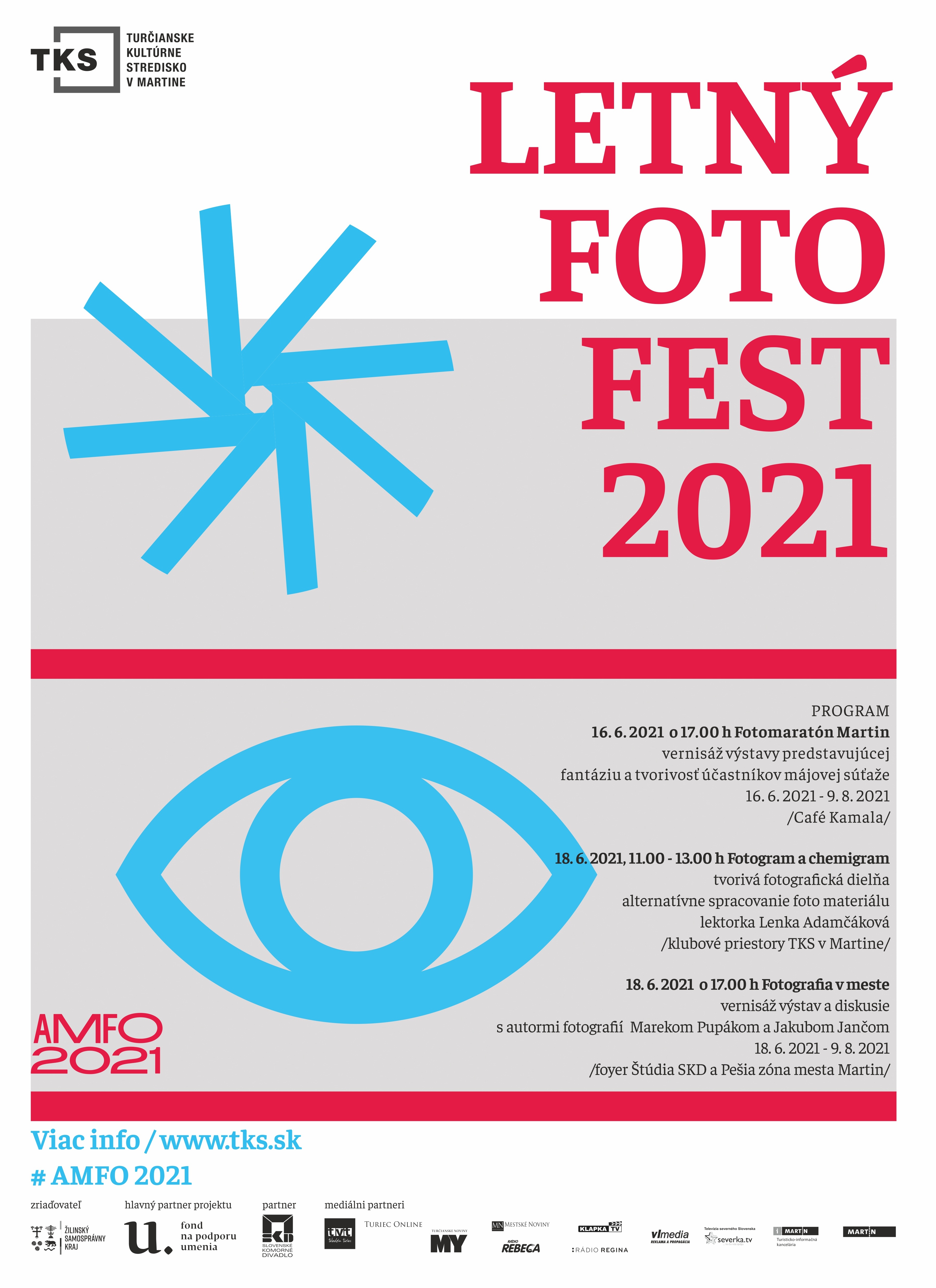 LETNÝ FOT FEST - PROGRAM: CAFÉ KAMALA – FOTOMARATÓN MARTIN 2021 Vernisáž - 16. jún 2021 o 17.00 h. PEŠIA ZÓNA MARTIN – FOTO VÝSTAVA - BUDE DOBRE – Marek Pupák. FOYAER ŠTÚDIA SKD V MARTINE – FOTO VÝSTAVA – POCHOPENIE PRALESA - Jakub Jančo. Slávnostné otvorenie výstav a diskusia s autormi - 18. jún 2021 o 17.00 h. Workshop - FOTOGRAM A CHEMIGRAM - Tvorivá foto dielňa s Lenkou Adamčákovou - 18. jún 2021 od 11.00 do 13.00 h.