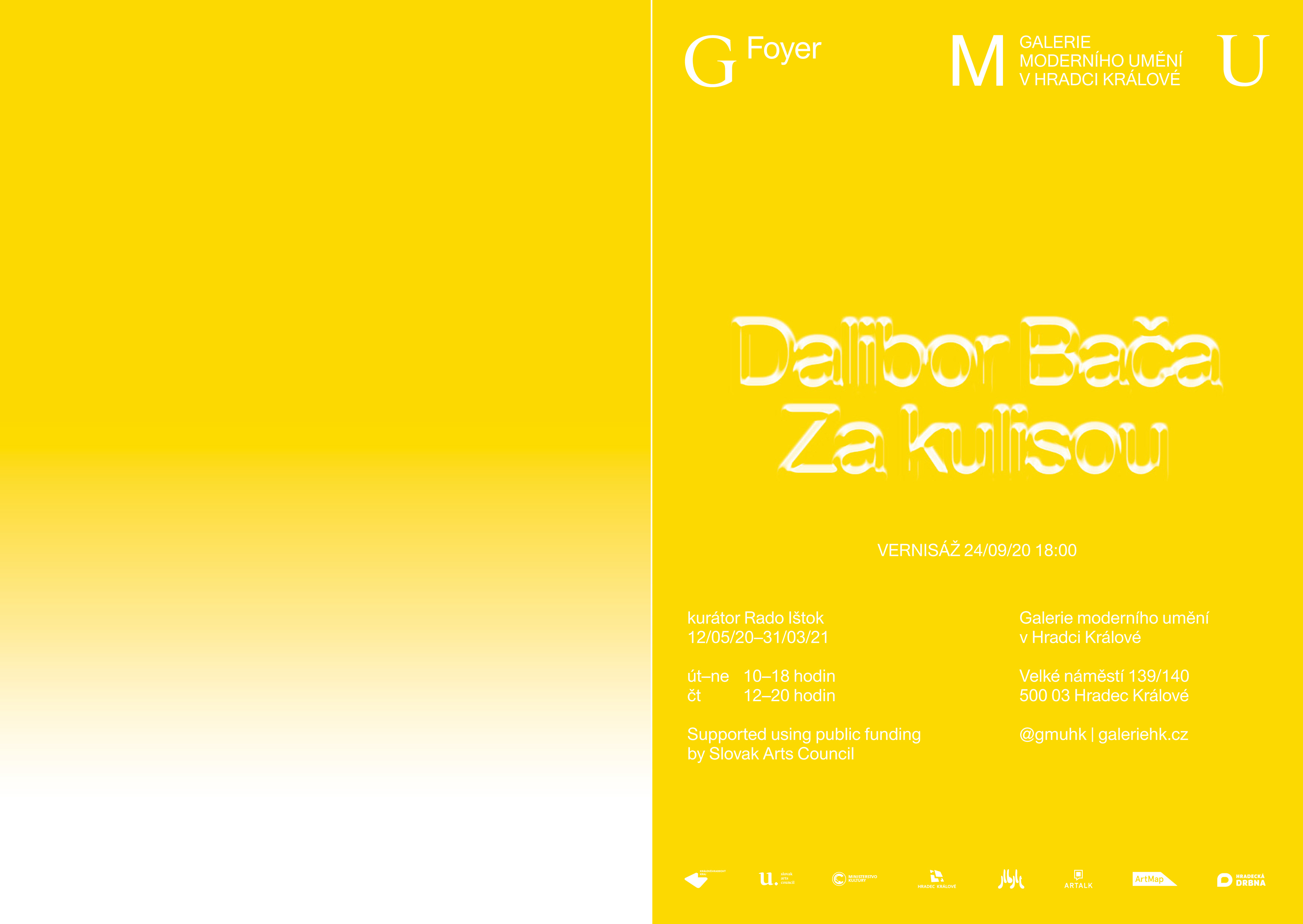 Dalibor Bača: Za kulisou Galérie moderního umění Hradec Králové 12/05/2020 – 31/03/2021 kurátor: Rado Ištok Intervence Za kulisou umělce Dalibora Bači sestává z fyzické architektury, komory zaklesnuté do vstupní haly Galerie moderního umění (GMU), a performativních pobytů umělce v této komoře.
