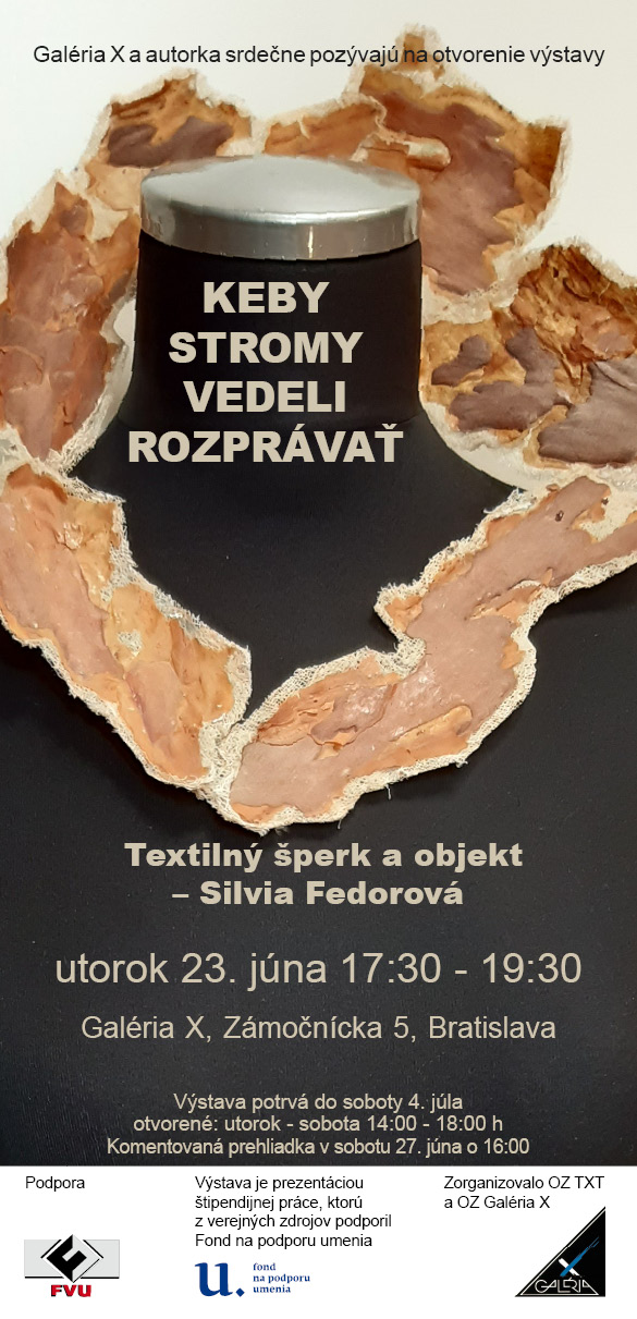Výstava výsledkov tvorivého štipendia, ktorého nosnou témou bol textilný šperk ekologického charakteru poukazujúci na relativitu hodnôt. Pre niekoho má kus kôry stromu väčšiu cenu ako zlatý šperk...