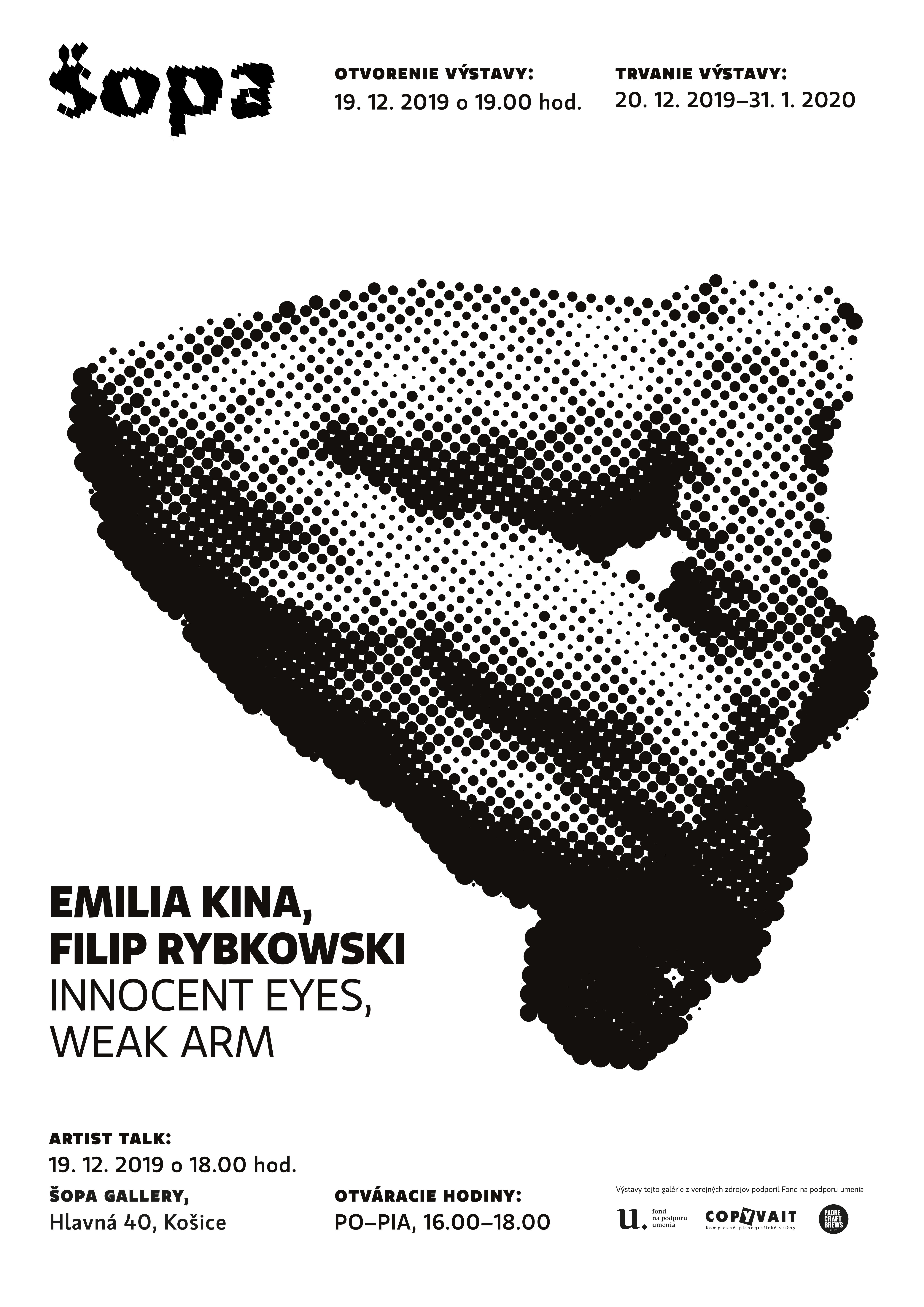 Emilia Kina Filip Rybkowski Artist Talk: 19. 12. 2019 o 18.00 hod. Otvorenie výstavy: 19. 12. 2019 o 19.00 hod. Výstava potrvá: 20. 12. — 31. 1. 2020 Otváracie hodiny: PO – PIA / 16.00 – 18.00 Šopa Gallery, Hlavná 40, Košice