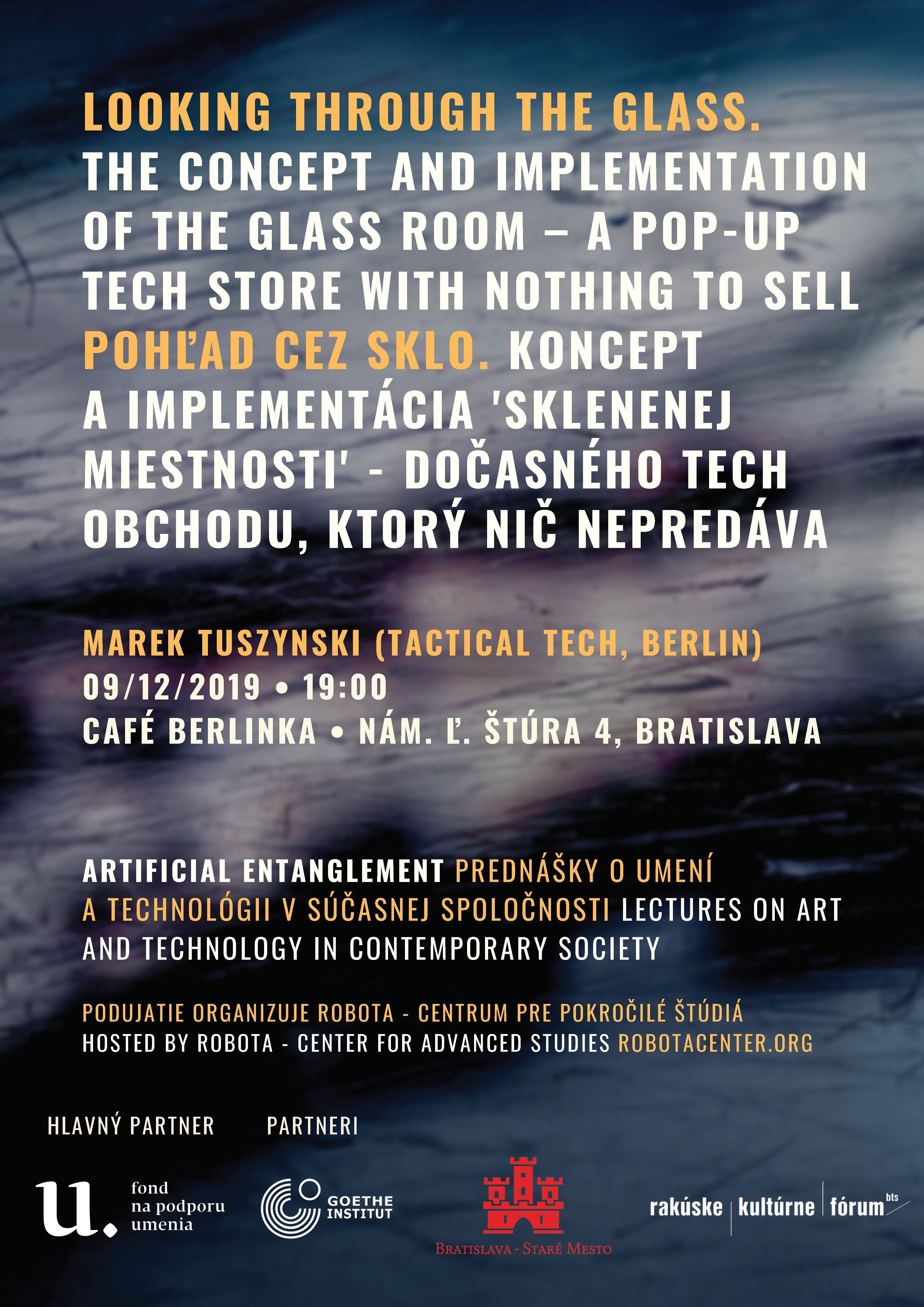 Prednáška prinesie prehľad o kurátorskom prístupe organizácie Tactical Tech pri koncipovaní svetoznámej výstavy „The Glass Room“ v Berlíne, New Yorku, Londýne a San Franciscu s vyše 50 000 návštevníkmi. Výstava - intervencia „The Glass Room“ komunikuje, zapája a vzdeláva širšie publikum o vplyve technológií na život.