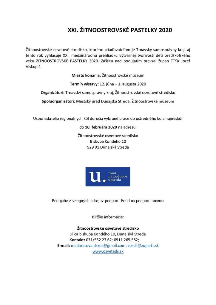 XXI. Žitnoostrovské pastelky 2020 – medzinárodná súťaž výtvarnej tvorivosti detí predškolského veku Posolstvá lásky, radosti a nádeje, že svet nebude, ale už teraz je lepší.