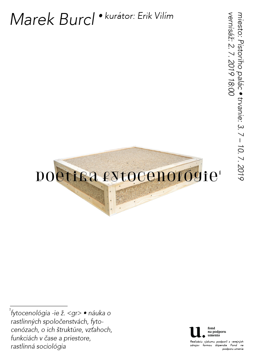 Marek Burcl predstaví na sólovej výstave Poetika fytocenológie aktuálny stav svojho dlhodobého výskumu možností výtvarnej stabilizácie krehkých rastlín prostredníctvom techniky galvanického pokovovania organických materiálov. Autor vytvorí pre priestory Pistoriho paláca špecifickú inštaláciu, pozostávajúcu z galvanizovaných rastlín a drobných živočíchov. Samotná inštalácia bude obsahovať napokon aj maľby vytvorené klasickými maliarskymi technikami.