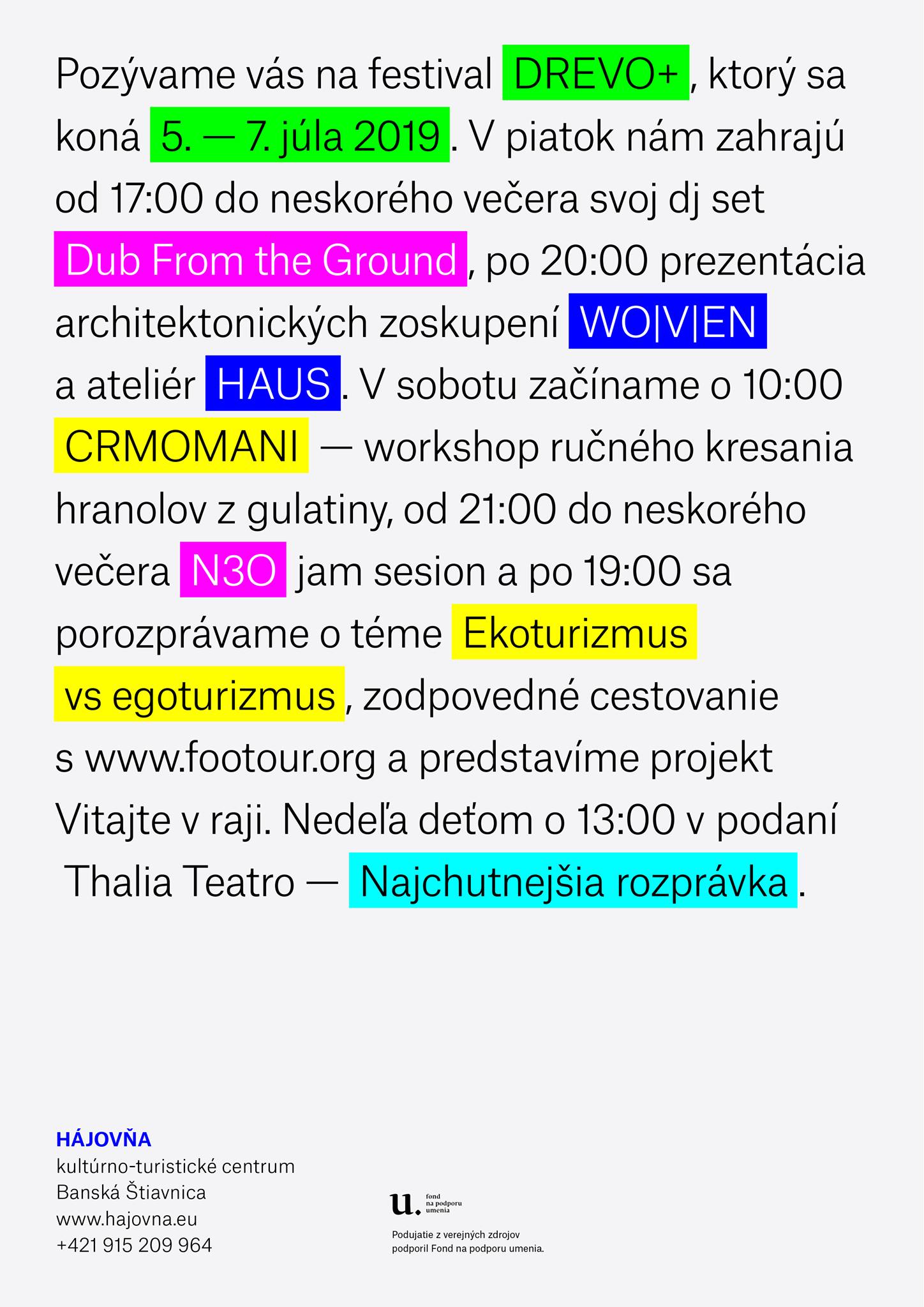 DREVO+ je nultý ročník festivalu na ktorom sa predstavia architektonické zoskupenia W/v/e/N a HAUS, zahrajú nám N3O a DJs Dub from the ground, diskusia eko vs. ego turizmus , o zodpovednom cestovaní s footour, workshop Crmomani, detské divadelné predstavenie Theatro Talia + sprievodný program.