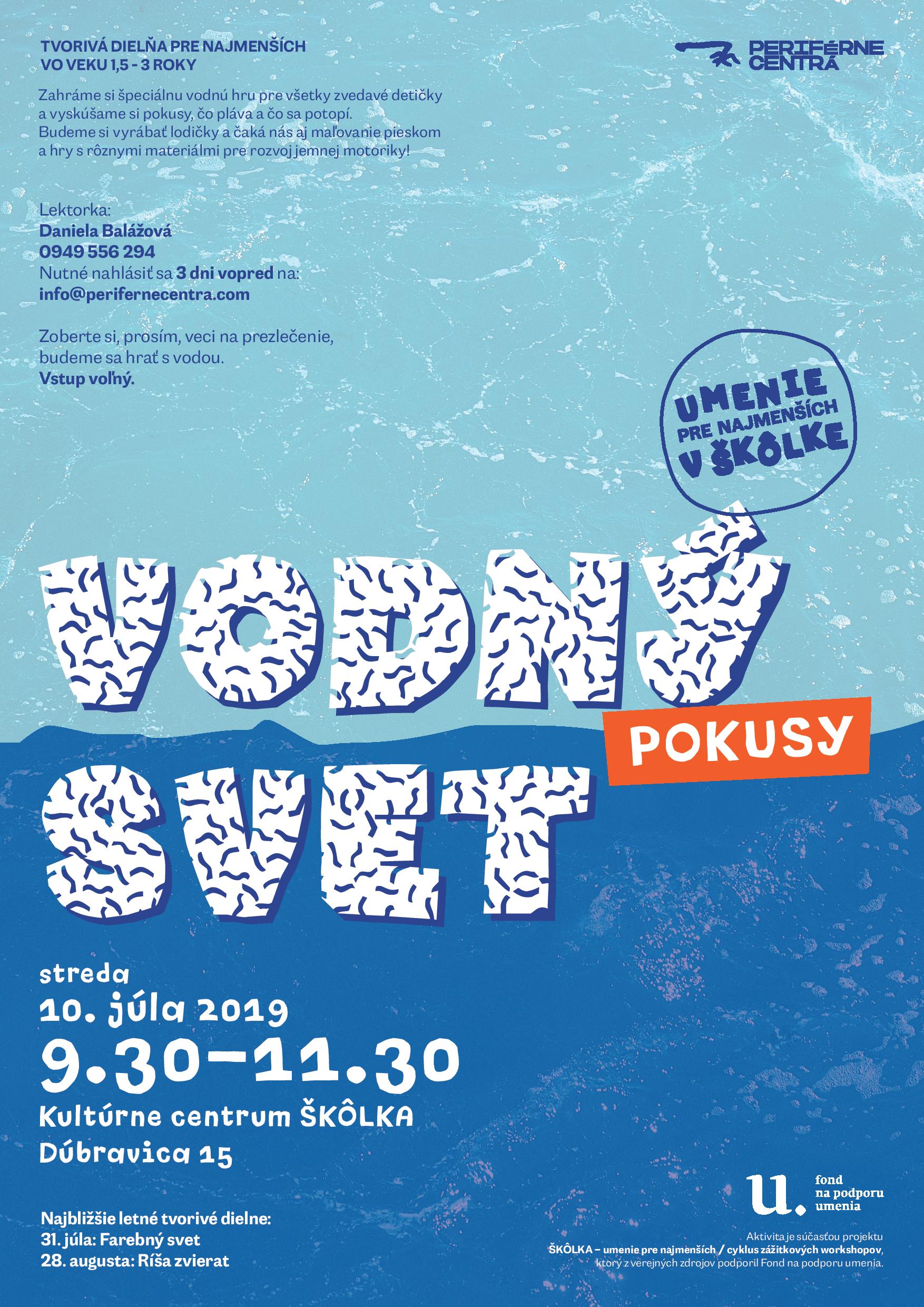 VODNÝ SVET / pokusy Umenie pre najmenších v Škôlke tvorivá dielňa pre deti vo veku 1,5 - 3 roky streda 10. júla 2019 o 9.30 - 11.30 kultúrne centrum ŠKÔLKA, Dúbravica 15 Pozývame deti vo veku 1,5 - 3 r., ich rodičov alebo starých rodičov na tretiu zážitkovú tvorivú dielňu so skúsenou lektorkou.