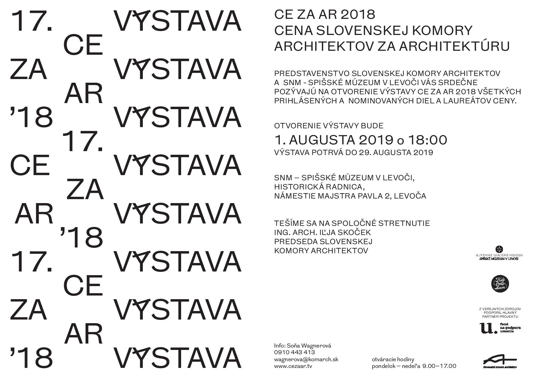Predstavenstvo Slovenskej komory architektov, v spolupráci so SNM - Spišské múzeum v Levoči, pozýva na vernisáž výstavy Ceny Slovenskej komory architektov za architektúru CE ZA AR 2018. Výstava všetkých prihlásených a nominovaných diel a laureátov ocenenia bude uvedená 1. augusta o 18:00, vo výstavných priestoroch SNM - Spišského múzea v Levoči, Námestie Majstra Pavla 2.