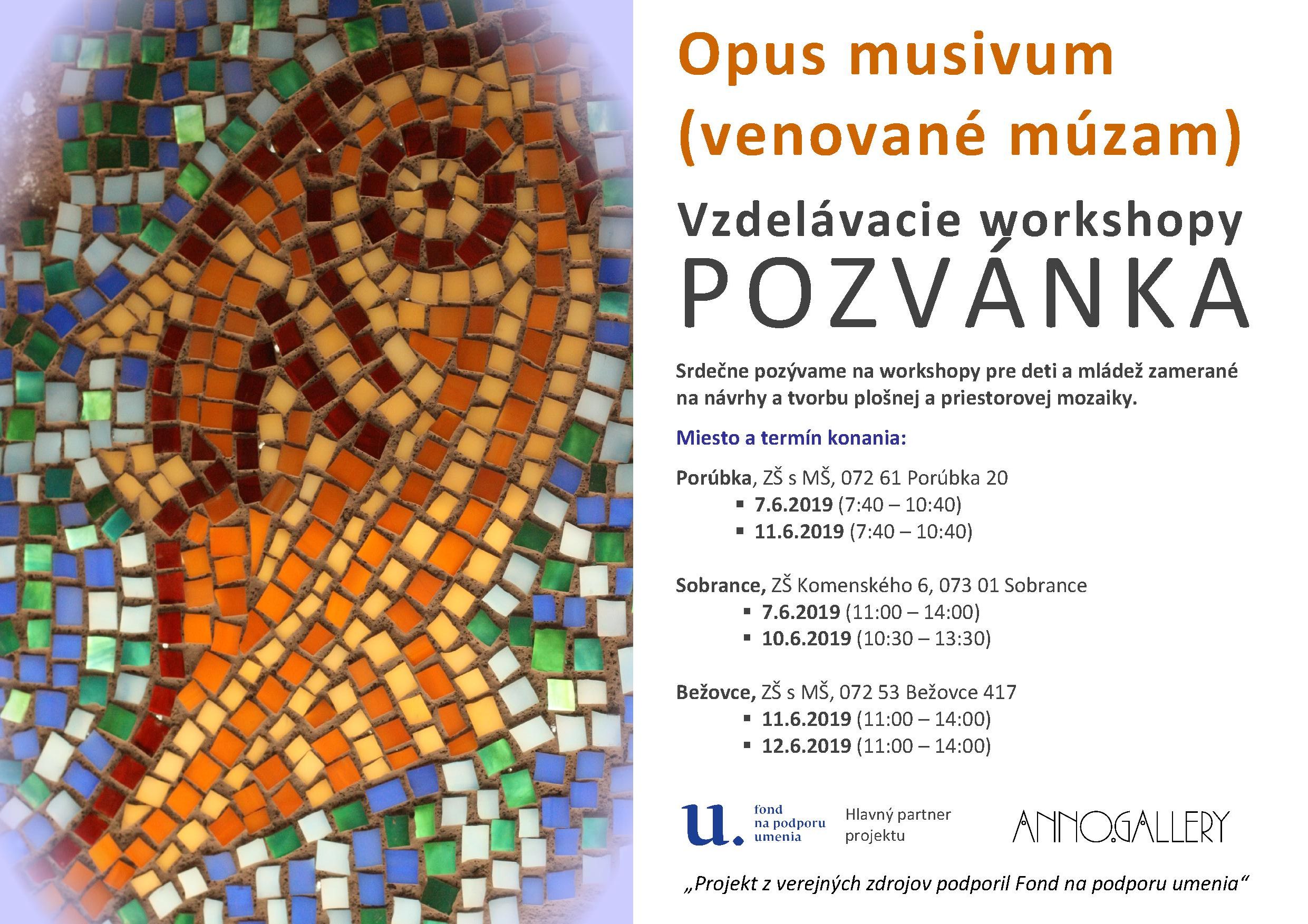 Projekt je zameraný na výchovu k vizuálnemu umeniu, na kultivovanie a získavanie nového publika v oblasti vizuálneho umenia prostredníctvom zrealizovania vzdelávacích workshopov pre deti a mládež, tematicky orientovaných na výtvarné návrhy a tvorbu plošnej a priestorovej mozaiky.