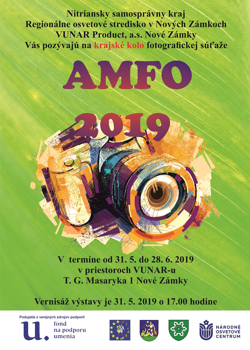 Regionálne osvetové stredisko v Nových Zámkoch v zriaďovacej pôsobnosti Nitrianskeho samosprávneho kraja Vás srdečne pozýva na vernisáž a výstavu krajského kola AMFO 2019. 47. ročník krajskej postupovej súťaže a výstavy amatérskej fotografie sa uskutoční 31. mája 2019 o 17.00 hod. v priestoroch Vunar Produckt a.s. T. G. Masaryka 4979/1, 940 02 Nové Zámky.