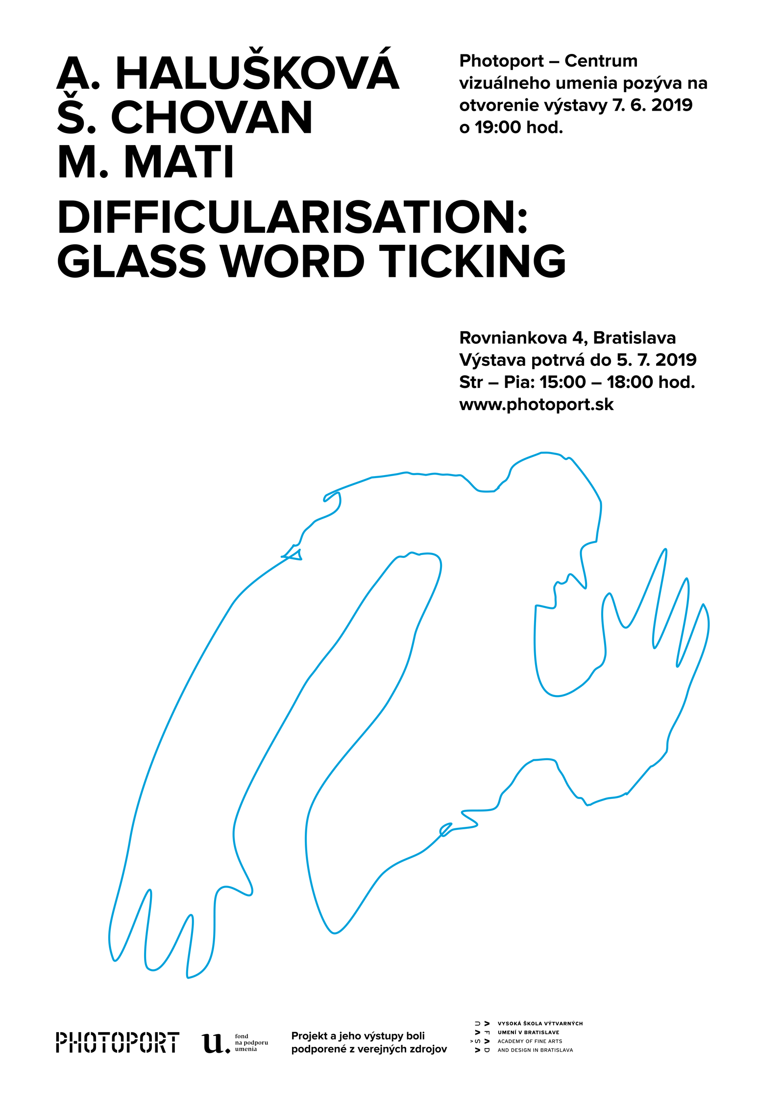 Difficularisation: Glass Word Ticking Photoport Rovniankova 4 str - pia: 15:00 - 18:00 výstava potrvá do 5.7.2019 Výstava diplomových prác Alžbety Haluškovej, Mareka Matiho a Šimona Chovana - študentov ateliéru Priestor z Katedry Vizuálnej komunikácie VŠVU.