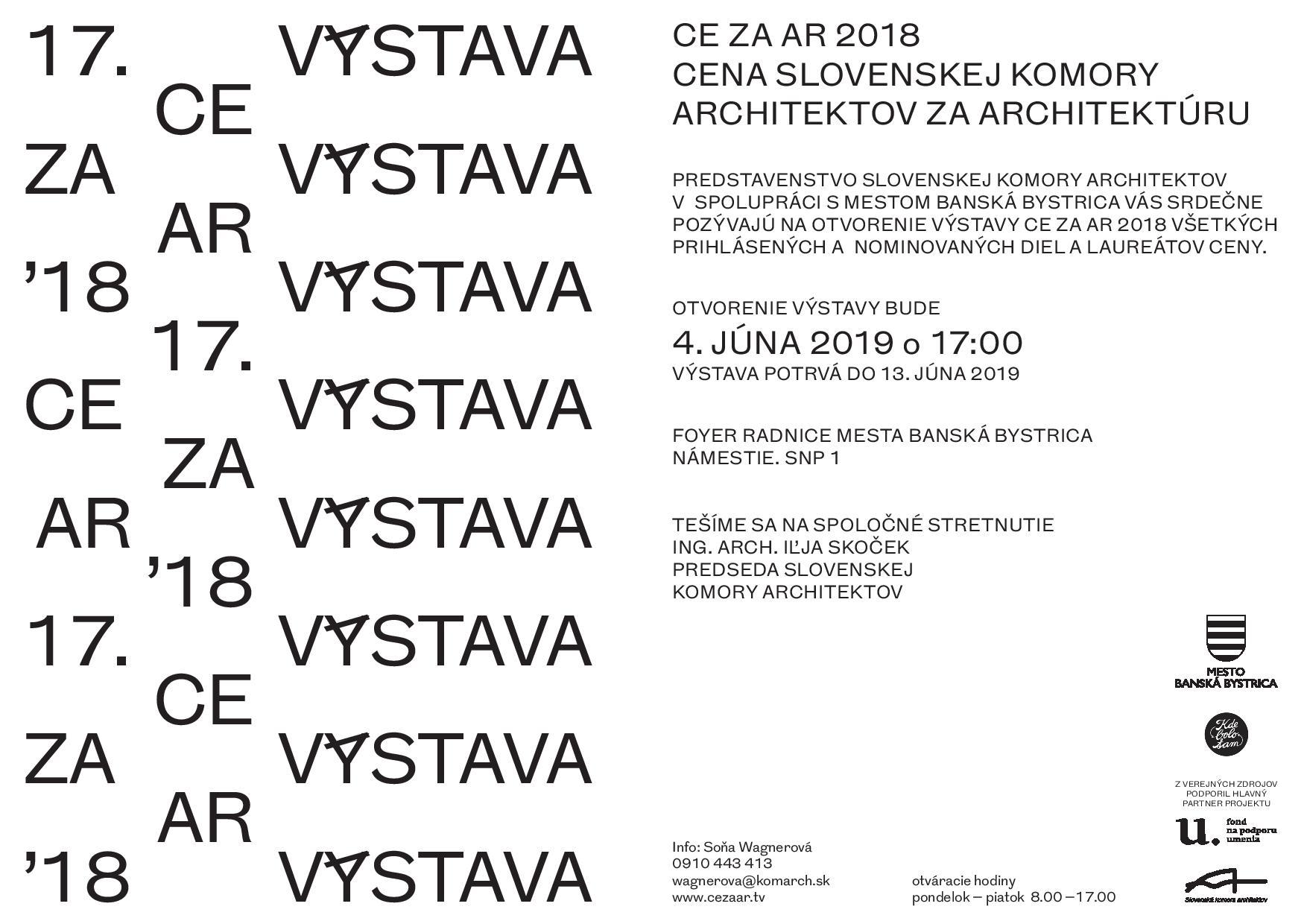 Predstavenstvo Slovenskej komory architektov pozýva na vernisáž výstavy Ceny Slovenskej komory architektov za architektúru CE ZA AR 2018. Výstava všetkých prihlásených a nominovaných diel a laureátov ocenenia bude uvedená 4. júna o 17:00, v priestoroch Foyer Radnice mesta Banská Bystrica, Nám. SNP 1.