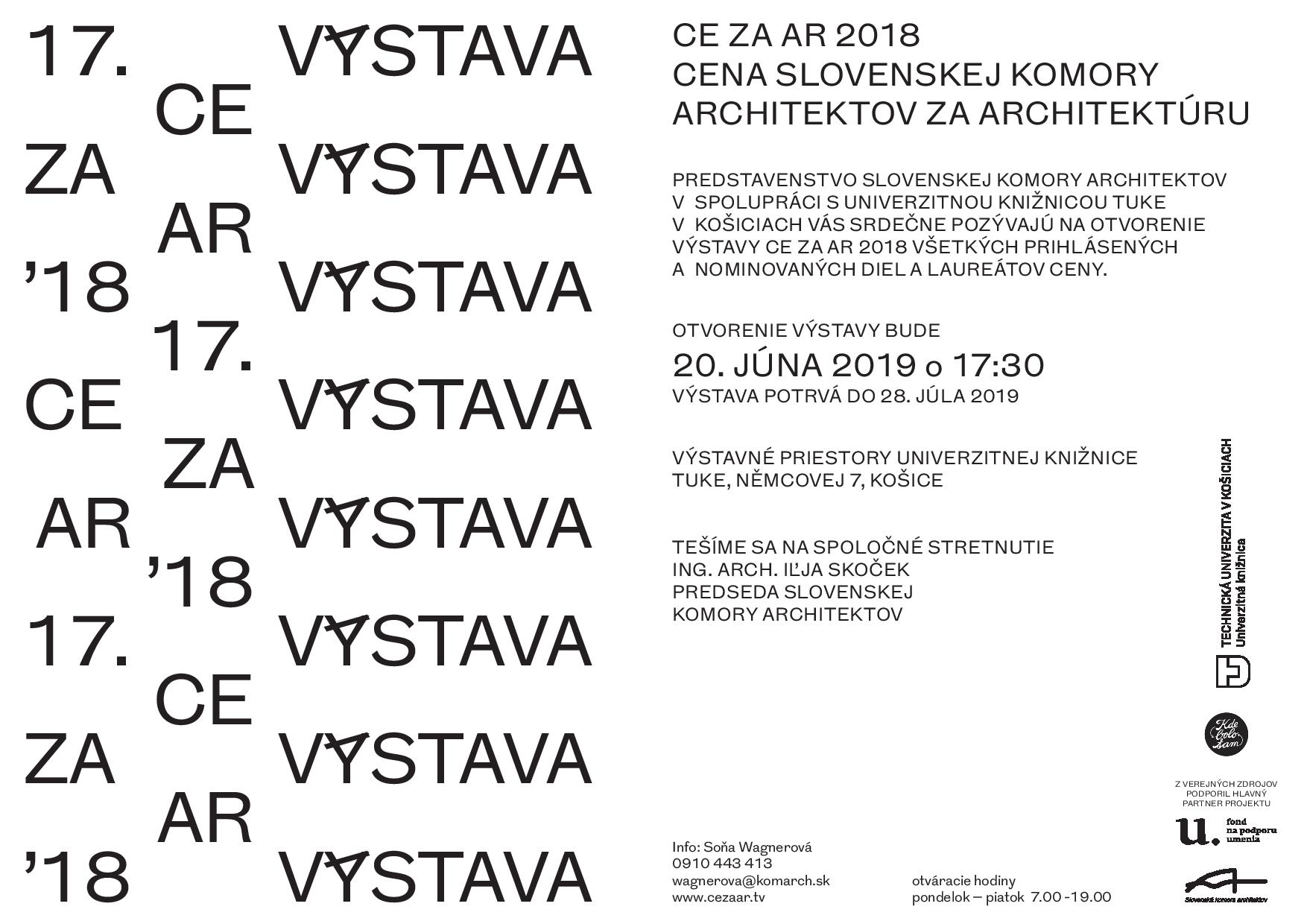 Predstavenstvo Slovenskej komory architektov pozýva na vernisáž výstavy Ceny Slovenskej komory architektov za architektúru CE ZA AR 2018. Výstava všetkých prihlásených a nominovaných diel a laureátov ocenenia bude uvedená 20. júna o 17:30, vo výstavných priestoroch Univerzitnej knižnice TUKE, Němcovej 7, Košice.