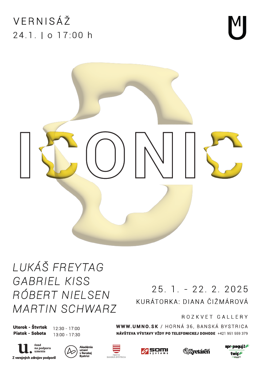 Pozývame Vás na vernisáž výstavy ICONIC autori: Róbert Nielsen, Martin Schwarz, Lukáš Freytag, Gabriel Kiss kurátorka: Diana Čižmárová 24.1. 2025 o 17:00 hod. Rozkvet Gallery, Horná 36, Banská Bystrica, 1. poschodie