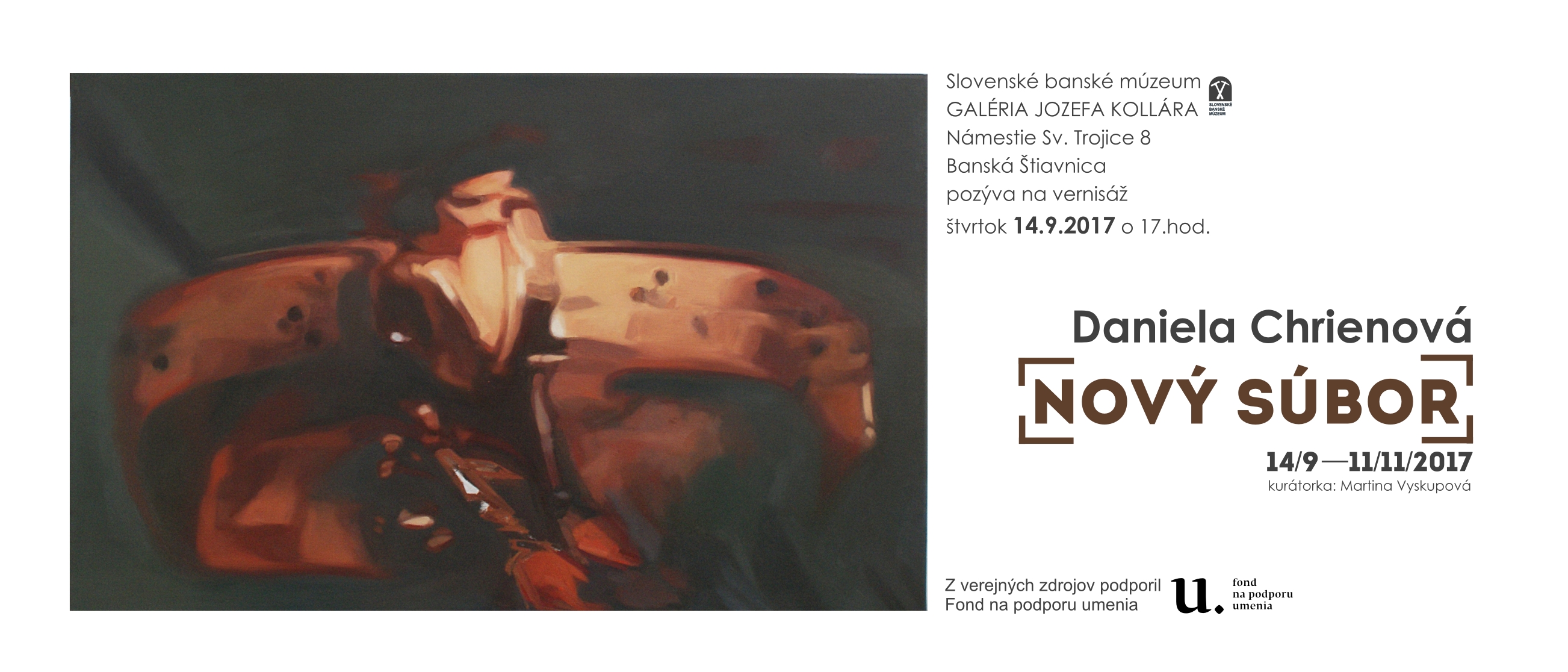 Daniela Chrienová / NOVÝ SÚBOR/ Galéria Jozefa Kollára, Nám. sv. Trojice 8, Banská Štiavnica Výstava je prezentáciou najnovšej tvorby maliarky Daniely Chrienovej (*1984), ktorá sa v rámci svojho výtvarného programu sústreďuje na problémy súvisiace s premenami a vlastnosťami rôznych typov obrazov v dnešnom vizuálnom prostredí. V rámci výstavy bude uvedený rovnomenný katalóg dokumentujúci najnovšiu tvorbu autorky. Kurátorka výstavy: Martina Vyskupová