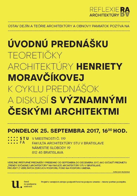 Prednáška teoretičky architektúry H. Moravčíkovej je úvodom k aktuálnej sérii prednášok a diskusií s architektmi. Po minulom roku, v rámci ktorého sa predstavili slovenskí architekti, prichádzajú tento rok na pôdu FA STU vybraní reprezentanti českej architektonickej scény. Úvodná prednáška priblíži štruktúru aktuálnej českej scény, predstaví pozvaných architektov a upozorní na to, akým spôsobom môže oboznámenie sa s ich tvorbou a autorským prístupom, priniesť nové impulzy pre slovenskú scénu.