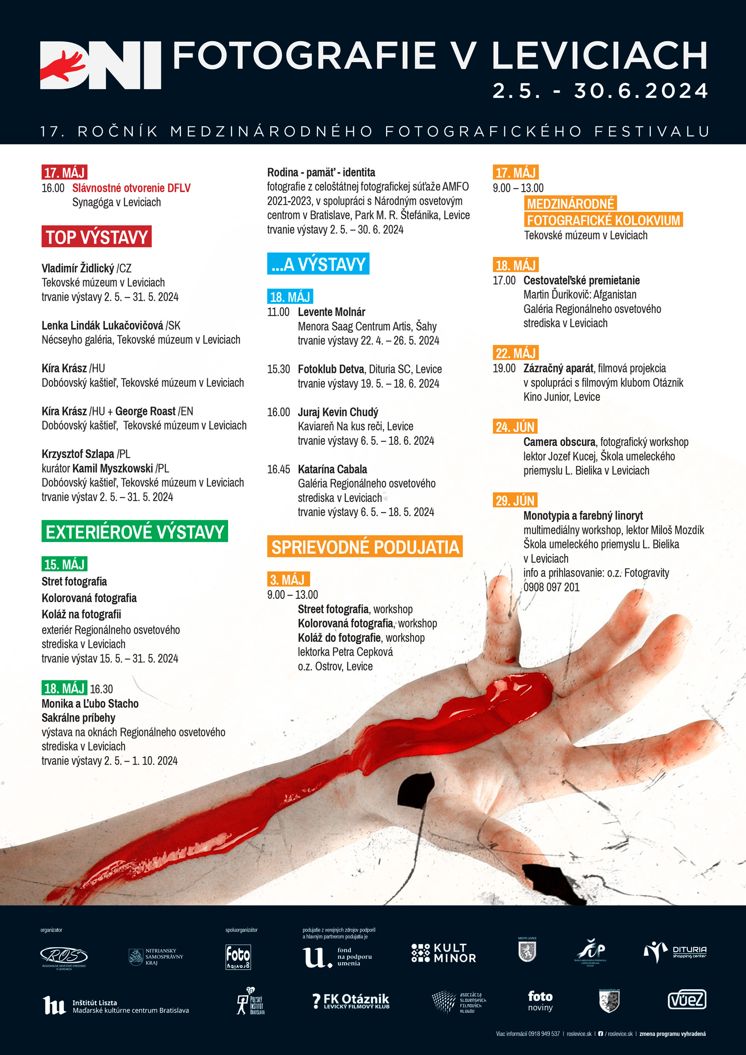Hlavným organizátorom podujatia Dni fotografie v Leviciach, 17. ročník medzinárodného festivalu je Regionálne osvetové stredisko v Leviciach a spoluorganizátorom Fotogravity o.z. Cieľom je prispieť k metodickému a odbornému vzdelávaniu amatérskych fotografov. Celé podujatie propaguje význam fotografie, ako jedného z najvýznamnejších vizuálnych umeleckých médií. V aktuálnom roku sme naplánovali 22 aktivít: 14 výstav a 8 sprievodných podujatí v trvaní máj-jún 2024.