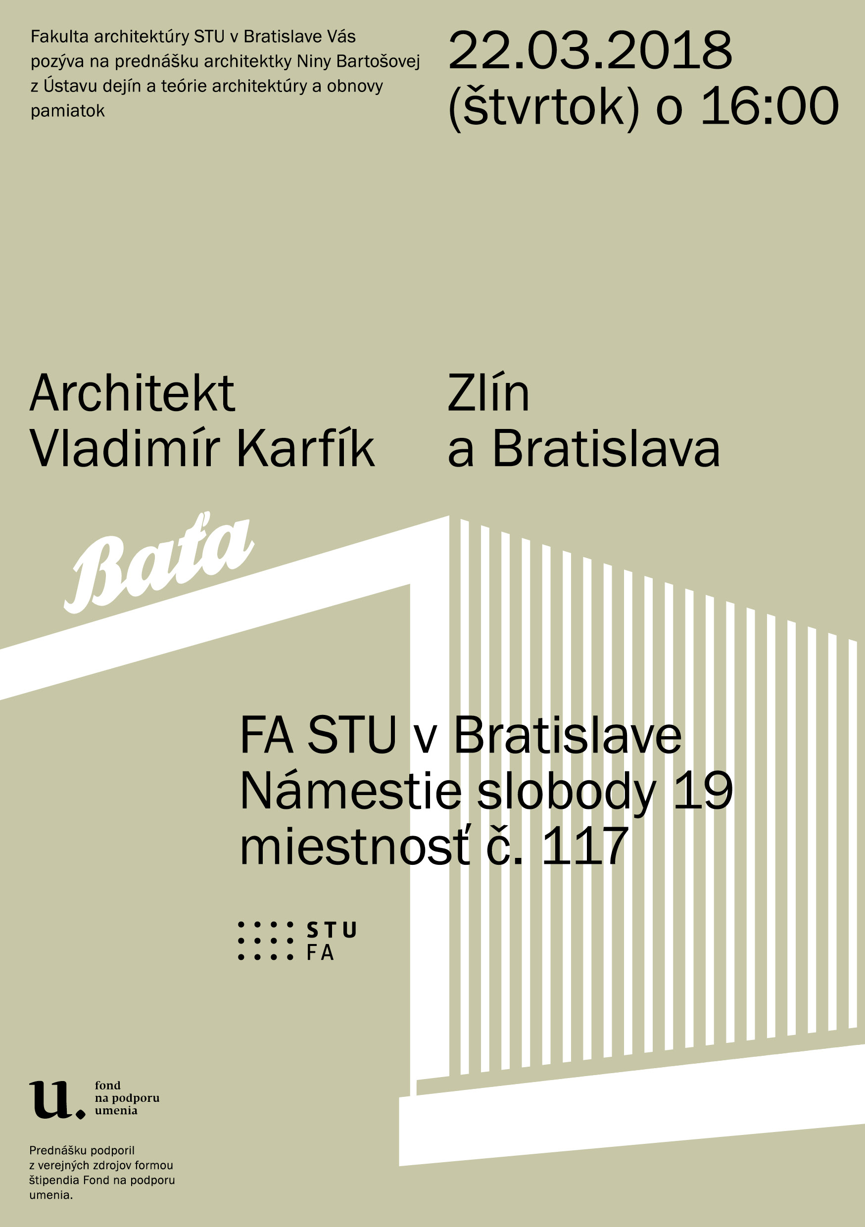 Prednáška Niny Bartošovej predstaví dielo Vladimíra Karfíka (1901 – 1996), výnimočného architektka českej a slovenskej architektonickej scény, so zameraním sa na jeho tvorivé obdobie počas pôsobenia v medzivojnovom Zlíne a v povojnovej Bratislave. Prednáška sa dotkne okrem známych stavieb aj architektovej menej známej tvorby a Karfíka priblíži nielen ako architekta, ale aj ako výraznú osobnosť. Prednáška sa bude konať na Fakulte architektúry STU v Bratislave, v miestnosti č. 117 o 16.00 h.