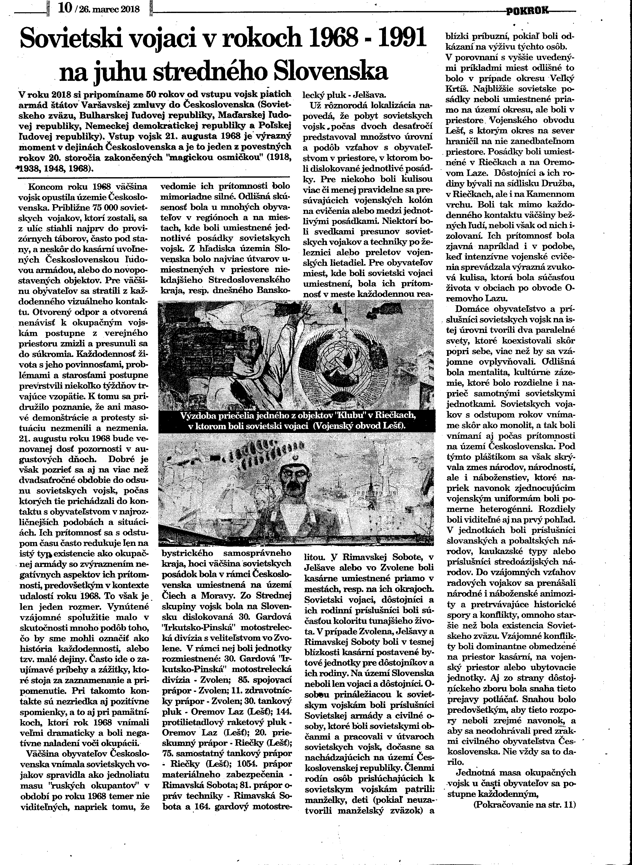 Záväzný výstup: Vypracovaný bude populárne ladený článok do regionálneho týždenníka v rozsahu minimálne 3 normostrany (publikovanie v termíne do odovzdania vecného vyhodnotenia projektu). Realizácia: Vypracovaný a odpublikovaný bol text "Sovietski vojaci v rokoch 1968 – 1991 na juhu stredného Slovenska" J. Aláča (autora výskumu) o rozsahu 4,5 normostrany v týždenníku okresu Veľký Krtíš Pokrok, r. XLV., č. 13, 26. marec 2018, s. 10 – 11.