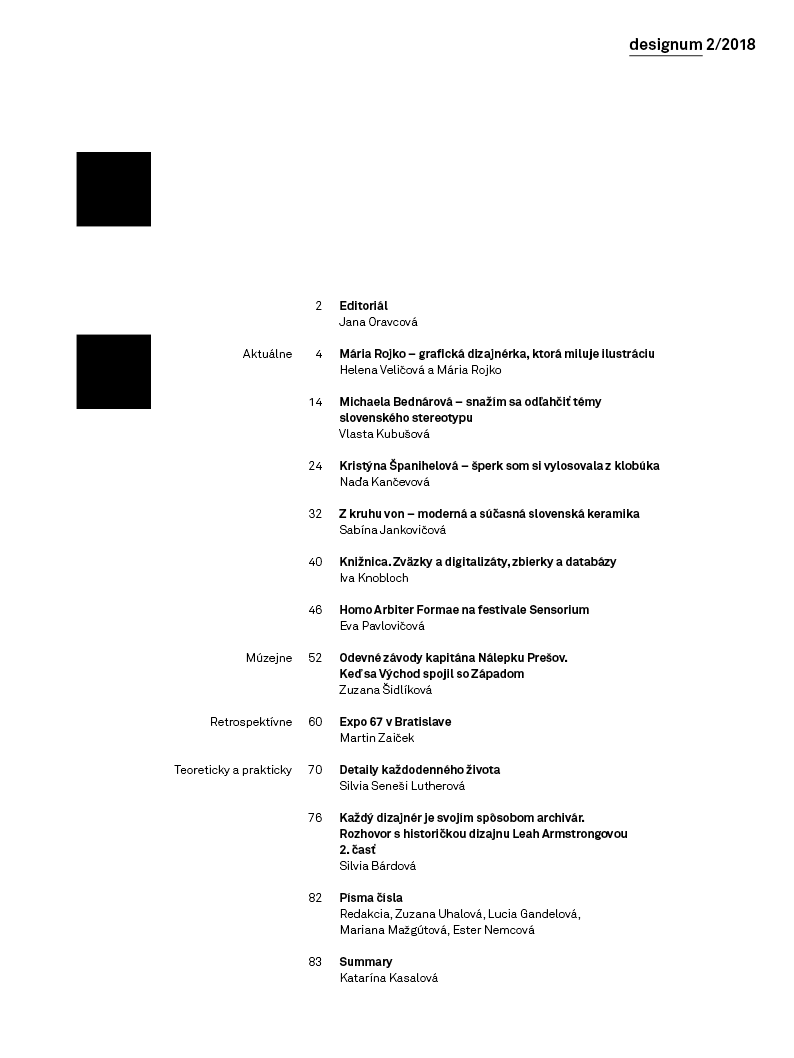 Odborný článok "Detaily každodenného života", publikovaný v časopise Designum 2/2018, sa zameriava na reformné tendencie priekopníkov modernizácie kultúry bývania a umeleckopriemyselnej produkcie na prelome 19. a 20. storočia v Strednej a Západnej Európe. V interpretácii pôvodných teoreticko-kritických textov sleduje témy "estetizácie každodenného prostredia" a "zúčelnenia každodennosti". Text je súčasťou výskumného projektu Dizajn v texte a kontexte.