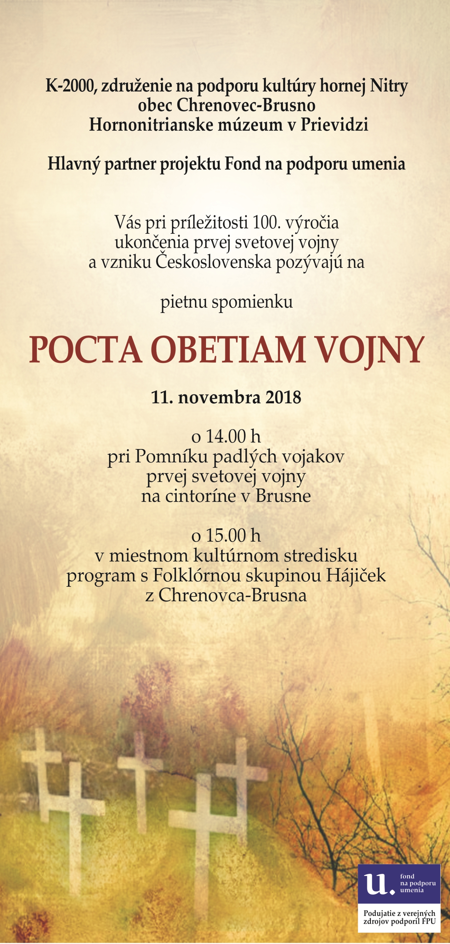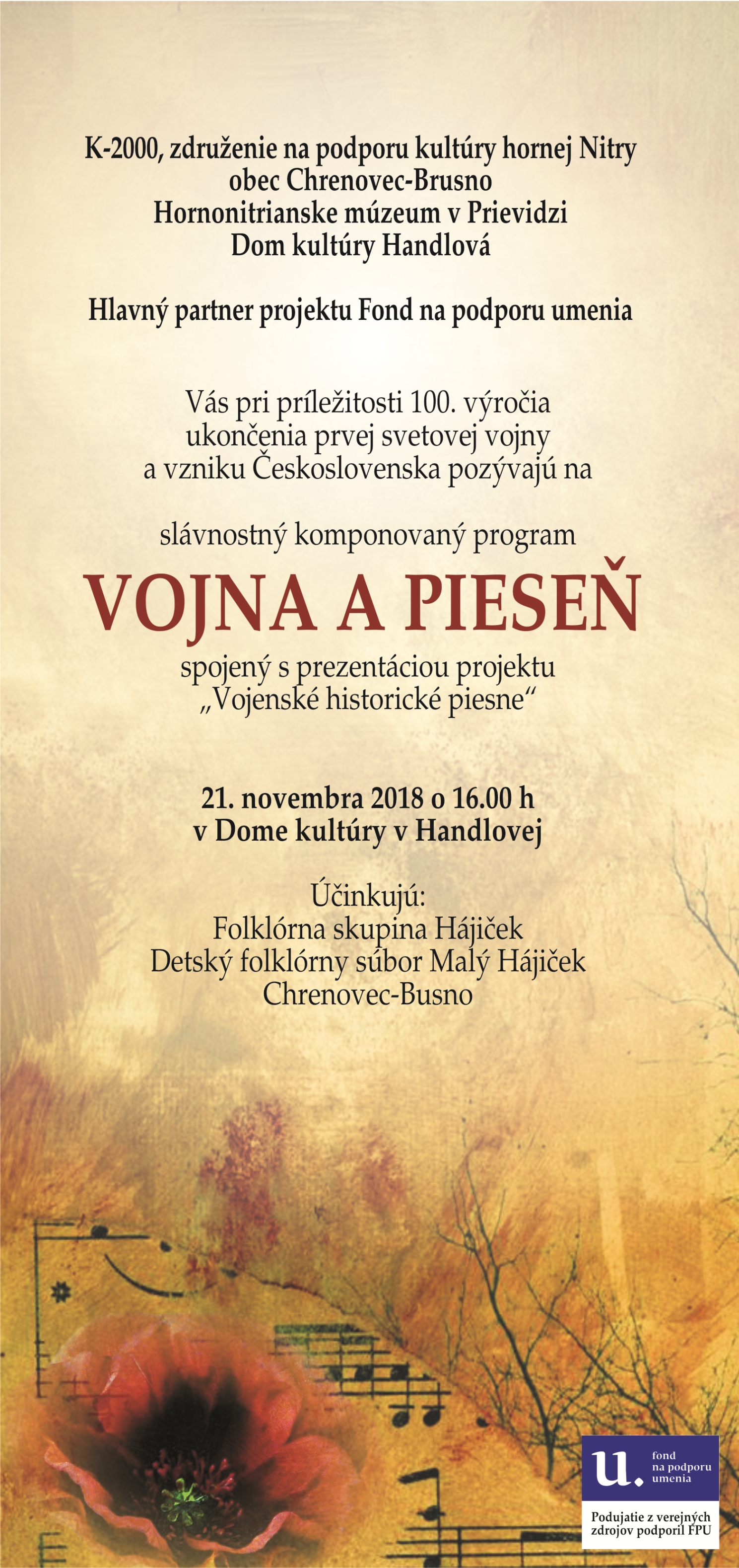 Podujatie venované 100. výročiu konca vojny a vzniku Československa. Sprievodné podujatie k projektu "Vojenské historické piesne - výskum", realizované združením K-2000 a obcou Chrenovec-Brusno.