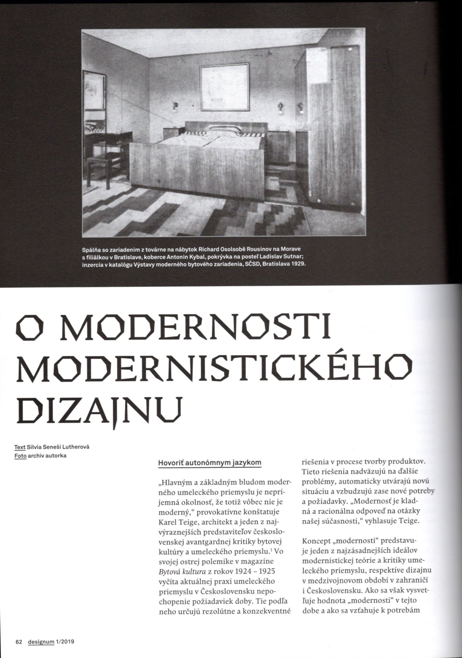 Vedecký článok O modernosti modernistického dizajnu, publikovaný v časopise Designum 1/2019, vychádza z výskumného projektu Dizajn v texte a kontexte. Zameriava sa na reformné modernizačné tendencie v kultúre bývania a umeleckopriemyselnej (dizajnérskej) produkcii od začiatku 20. storočia po medzivojnové obdobie v strednej a západnej Európe. V pôvodných textoch výtvarníkov a kritikov sleduje a interpretuje ideál „modernosti“ vo vzťahu ku koncepciám „ducha doby“ a "autonómnej tvorby".
