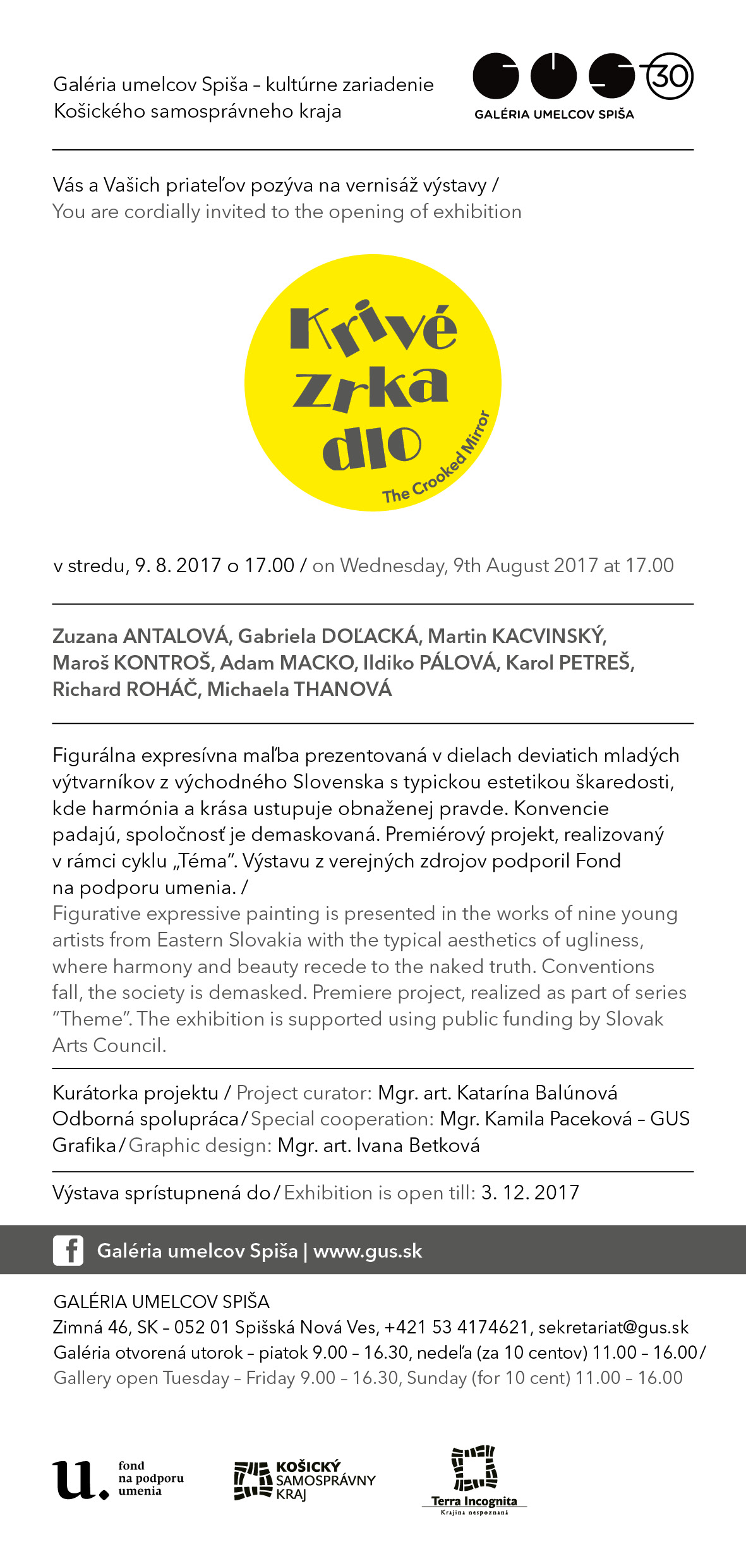 Galéria umelcov Spiša uvádza premiérovú interpretáciu expresívnej figurálnej maľby v dielach 9-tich mladých východoslovenských výtvarníkov pod názvom Krivé zrkadlo: Zuzana ANTALOVÁ, Gabriela DOĽACKÁ, Martin KACVINSKÝ, Maroš KONTROŠ, Adam MACKO, Ildikó PÁLOVÁ, Karol PETREŠ, Richard ROHÁČ a Michaela THANOVÁ. Spoločným menovateľom prezentovaných malieb je výrazné gesto, matéria farby, surovosť vyjadrenia a výpovede bez príkras a cenzúr. Výstava v kurátorskej koncepcii výtvarníčky Kataríny Balúnovej je ďalšou zo série originálnych tematických projektov pre galériu, ktorých cieľom je vytvoriť dialóg medzi mladými umelcami nastupujúcej generácie.