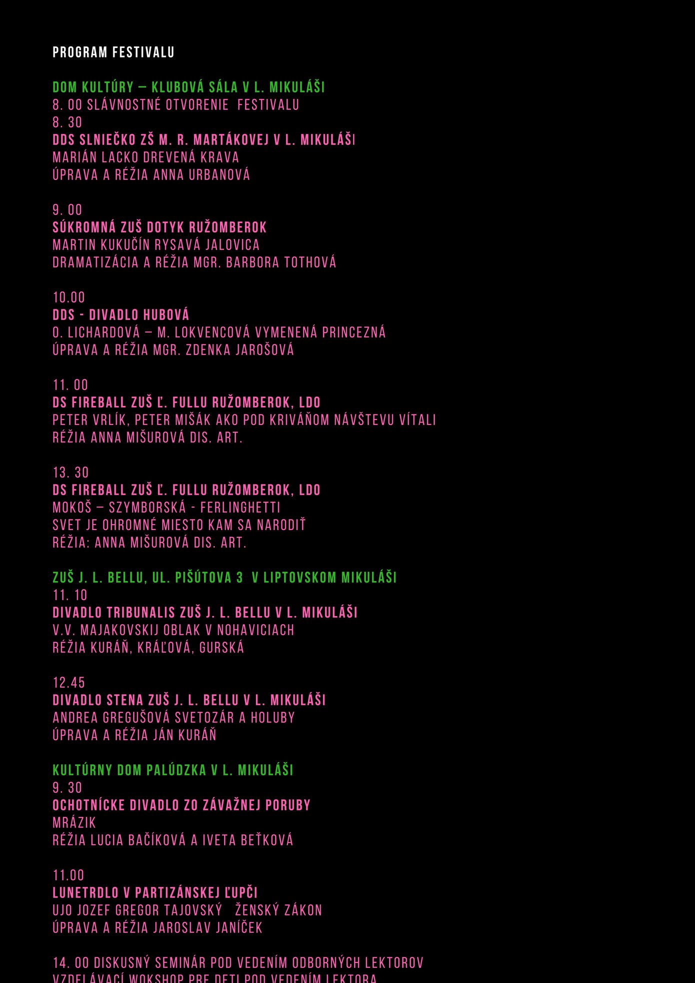 Fond na podporu umenia nenesie žiadnu zodpovednosť za úplnosť, správnosť a pravdivosť, ako ani za legalitu údajov uvedených v tejto časti webového portálu FPU. Všetky zverejnené informácie, v textovej, hypertextovej alebo obrazovej forme sú výlučnou zodpovednosťou prijímateľa finančných prostriedkov poskytnutých Fondom na podporu umenia, ktorý preberá zodpovednosť za zverejnené informácie súhlasom s podmienkami FPU a samotným zverejnením informácií na webovom portáli FPU.