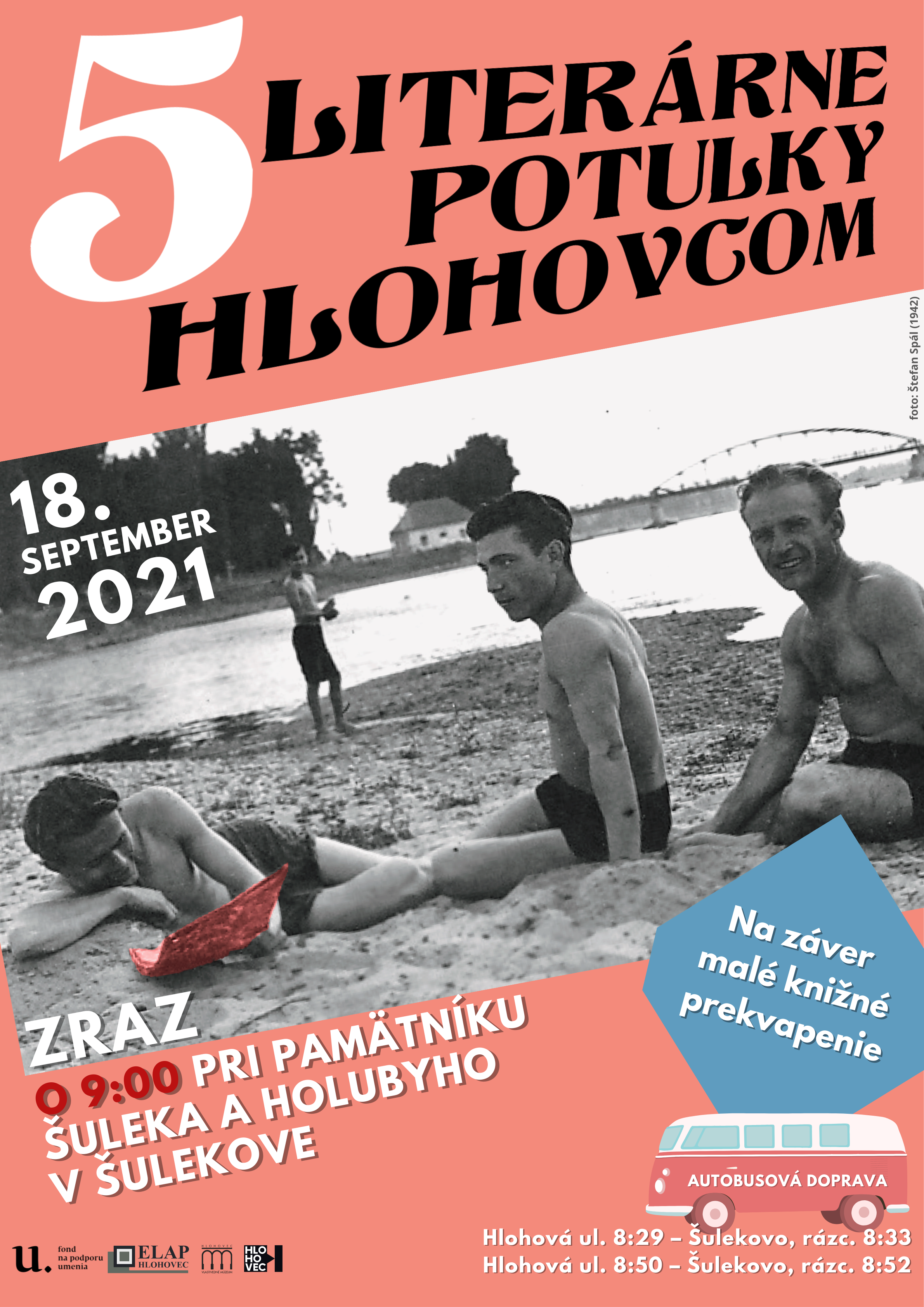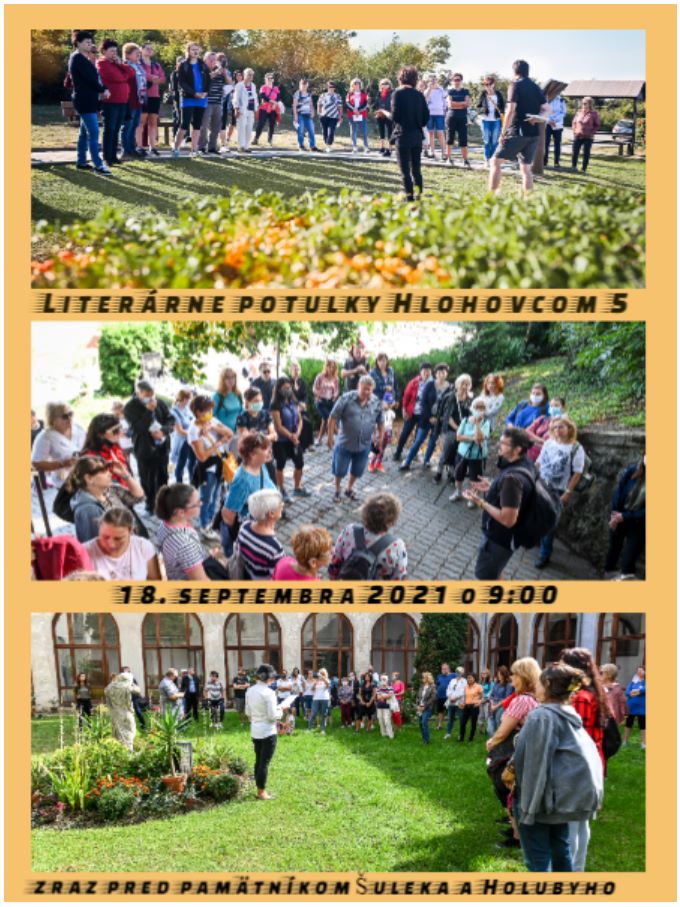 5. ročník Literárnych potuliek Hlohovcom začne 18. septembra 2021 o 9:00 pred pamätníkom Vilka Šuleka a Karola Holubyho v Šulekove, miestnej časti Hlohovca. Trasa povedie popri Váhu do Hlohovca, potulky budú končiť na nádvorí Robotníckeho domu v Hlohovci. Tento rok nás čaká opäť šesť zastávok na miestach, ktoré vstúpili do románov a básní: